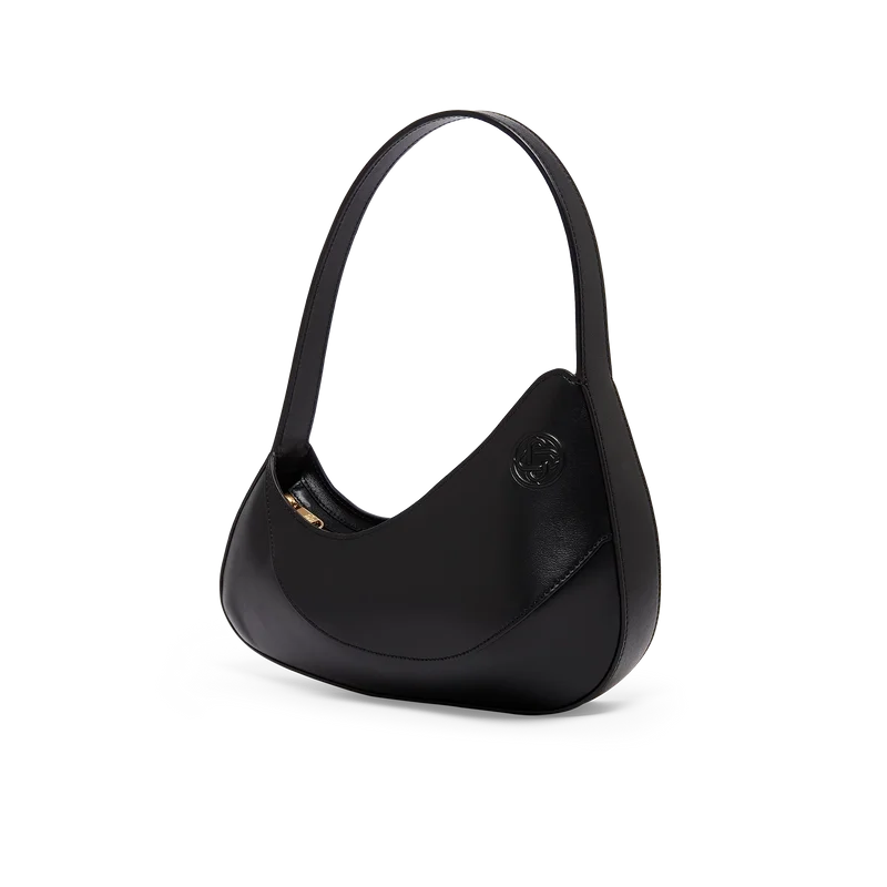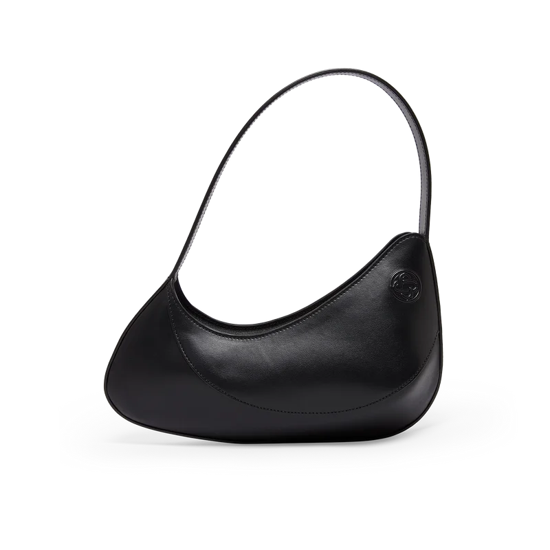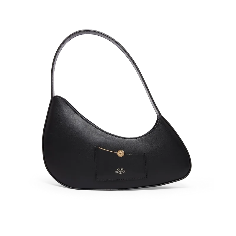 Den svarta Raver-väskan är en kroppsnära aftonväska tillverkad av get- och kalvskinn, med husets runda Casablanca-logotyp. Komplett med axelrem, dragkedja och ett innerfack.