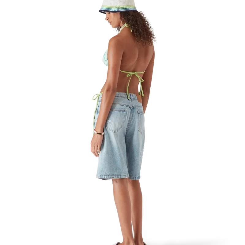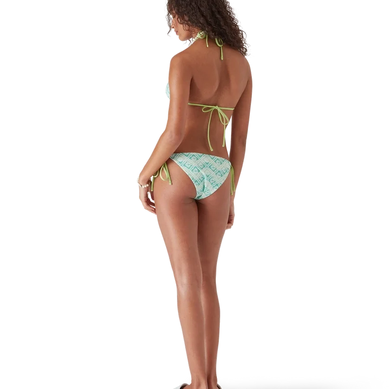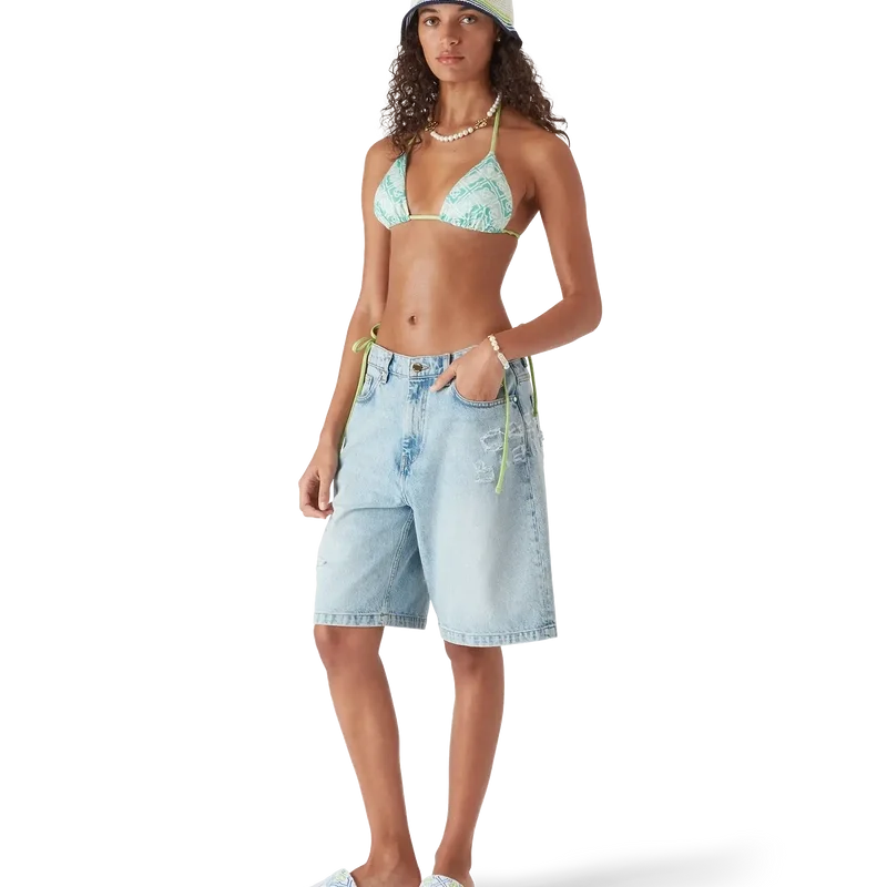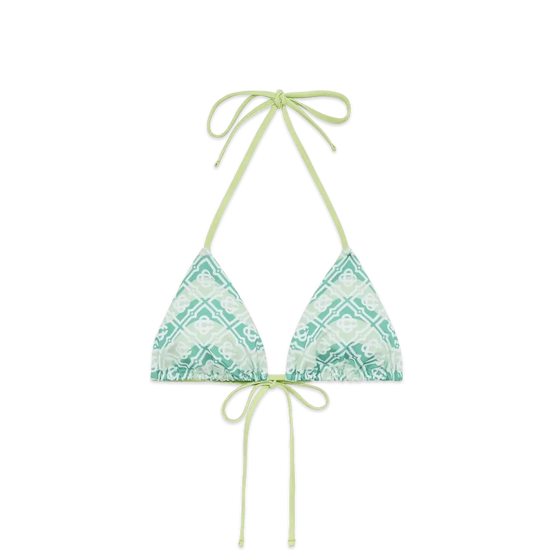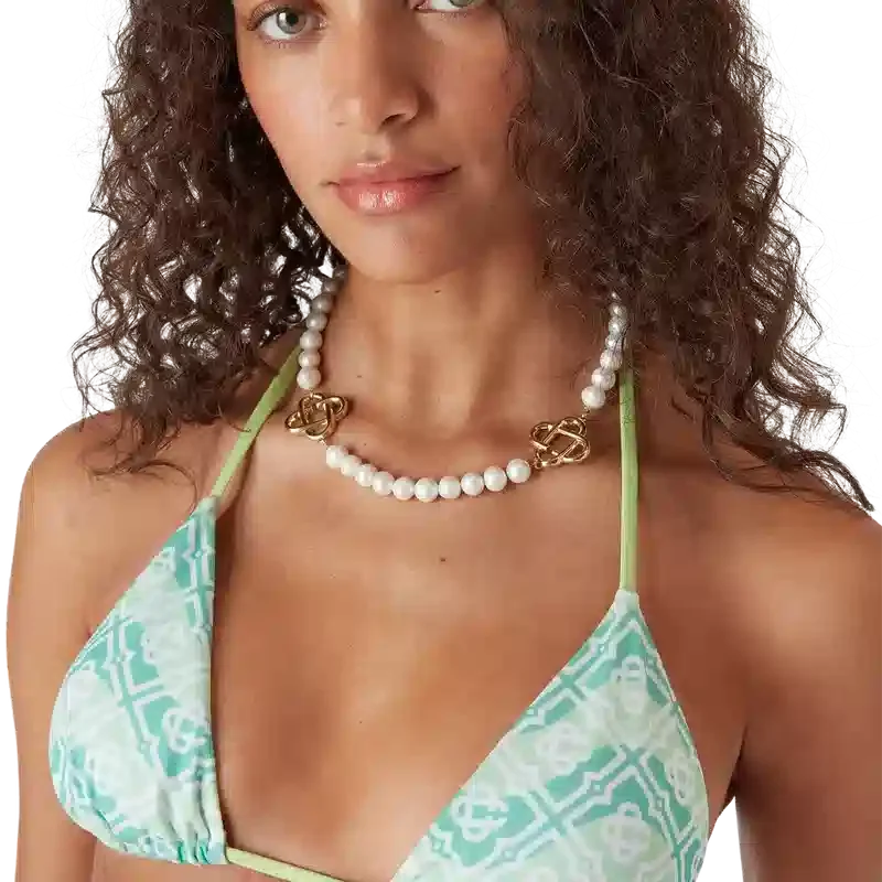 Wavy Monogram String Triangle Bikini Top är en raffinerad design med husets monogrammönster på en bakgrund inspirerad av Memphis-vågor. Kompletterad med guldkantade snörband, avtagbara kupor och husets signatur, den guldpläterade sammanlänkade CC-niten på vänster kupa – detta plagg är designat för att bäras med matchande bikinibotten.