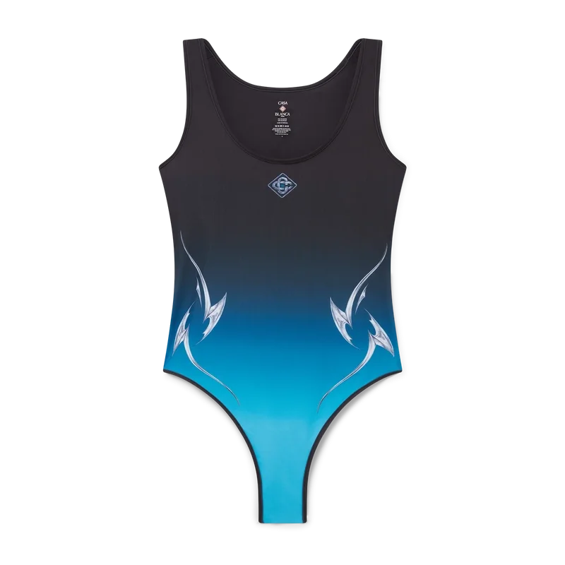 Baddräkten Blades har ett tryckt mönster och är tillverkad av ett tekniskt badtyg som andas. Den har ett motiv som leker med kontrasten mellan två motsatta känslor – bladets skärpa och den kalla, silverkromade ytan, i kontrast till naturens värme, som de djärva rosa och röda tonerna i en orkidéblomma. Vattnet tillför ett friskt och fräscht inslag till designen. Bikinitoppen har högt skurna ben, rund halsringning, utskärning i ryggen och märkets signaturdiamantlogo på bröstet.