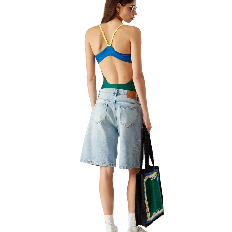 Den färgblockerade baddräkten är tillverkad av ett andningsbart tekniskt badtyg och har husets Casablanca-logotyp på bröstet. Den kompletteras med kontrastkanter, högt skurna ben, rund halsringning och utskärning i ryggen.