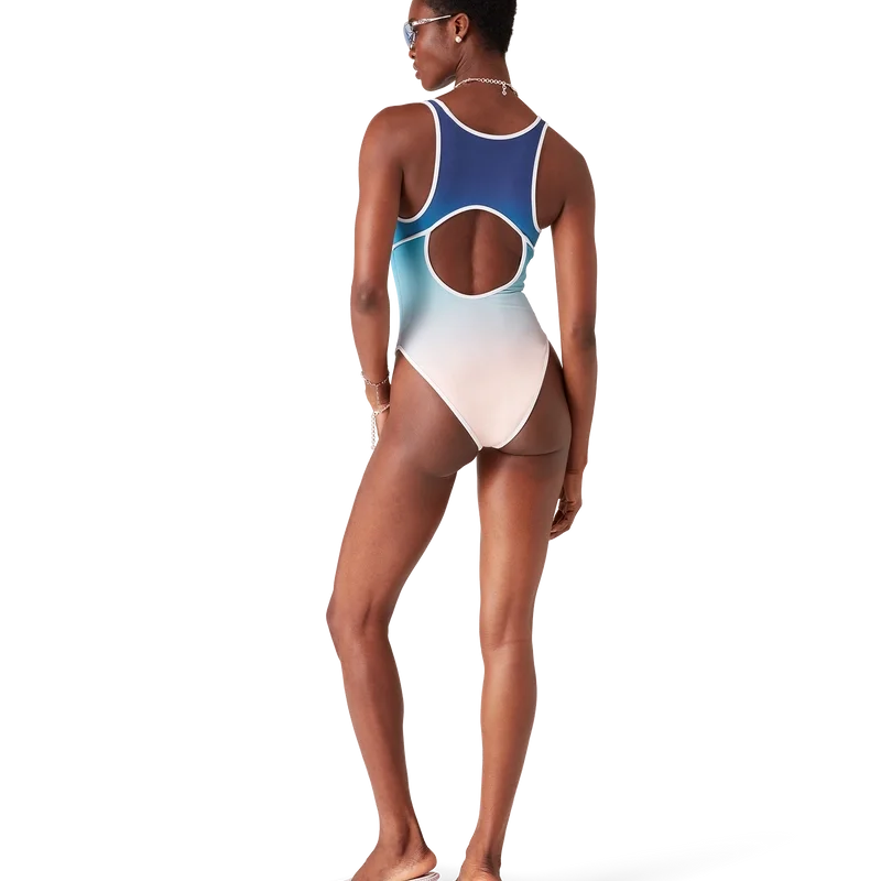 Gradient-baddräkten är ett tryckt plagg tillverkat av ett andningsbart polyestermaterial med säsongens gradientfärger. Den kompletteras med kontrasterande vita kanter, högt skurna ben, rund halsringning och djup rygg – detta plagg har märkets signatur, den sammanlänkade Cc-niten, på höften.
