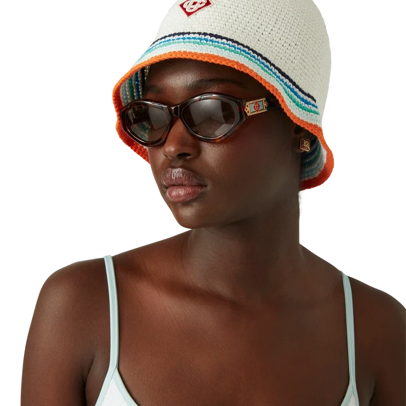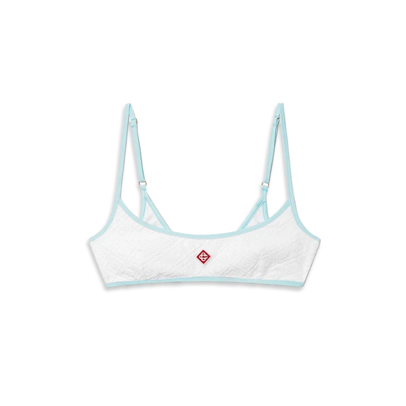 Bikinitoppen Jacquard Monogram har ett tryckt mönster och är tillverkad i ett andningsbart polyestermaterial med husets karakteristiska Diamond Monogram. Den kompletteras med ljusblå spaghettiband och kantband – denna modell är avsedd att bäras tillsammans med den matchande bikinibotten.