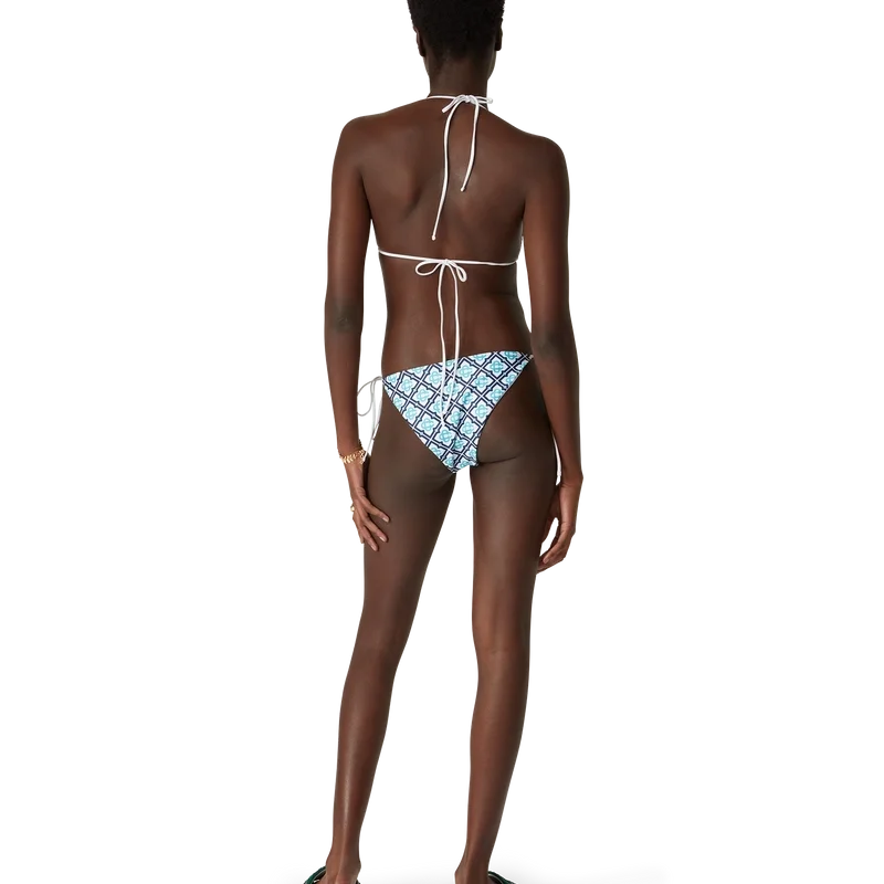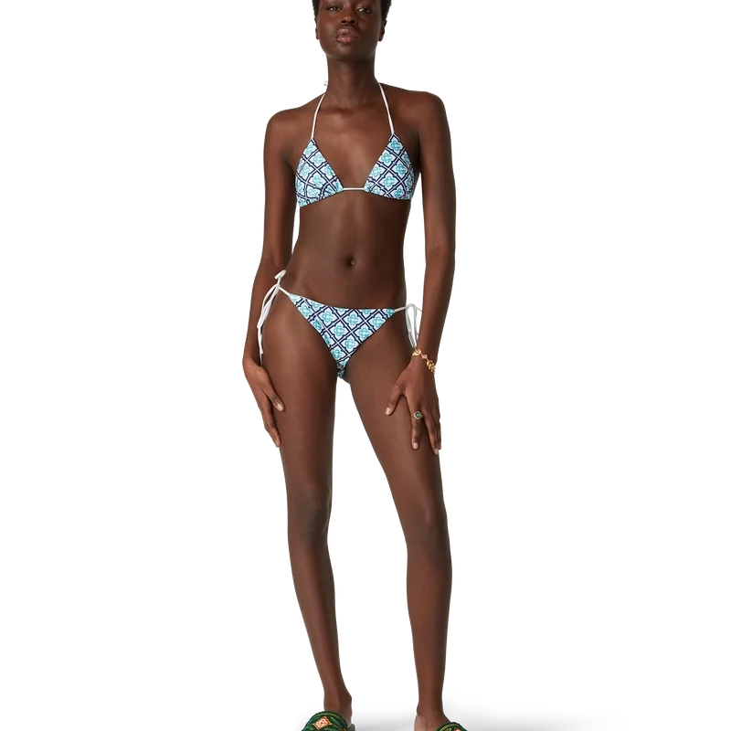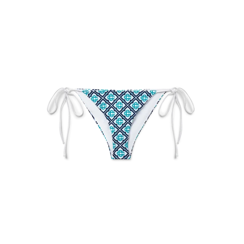 Monogram-bikinibotten är ett tryckt plagg tillverkat av ett andningsbart tekniskt tyg, med ett gradientmönster som ger en ny twist på Casablancas signaturtryck. Avslutad med vita kanter och snörning – detta plagg har husets signatur, den sammanlänkade CC-niten – avsedd att bäras med den matchande överdelen.