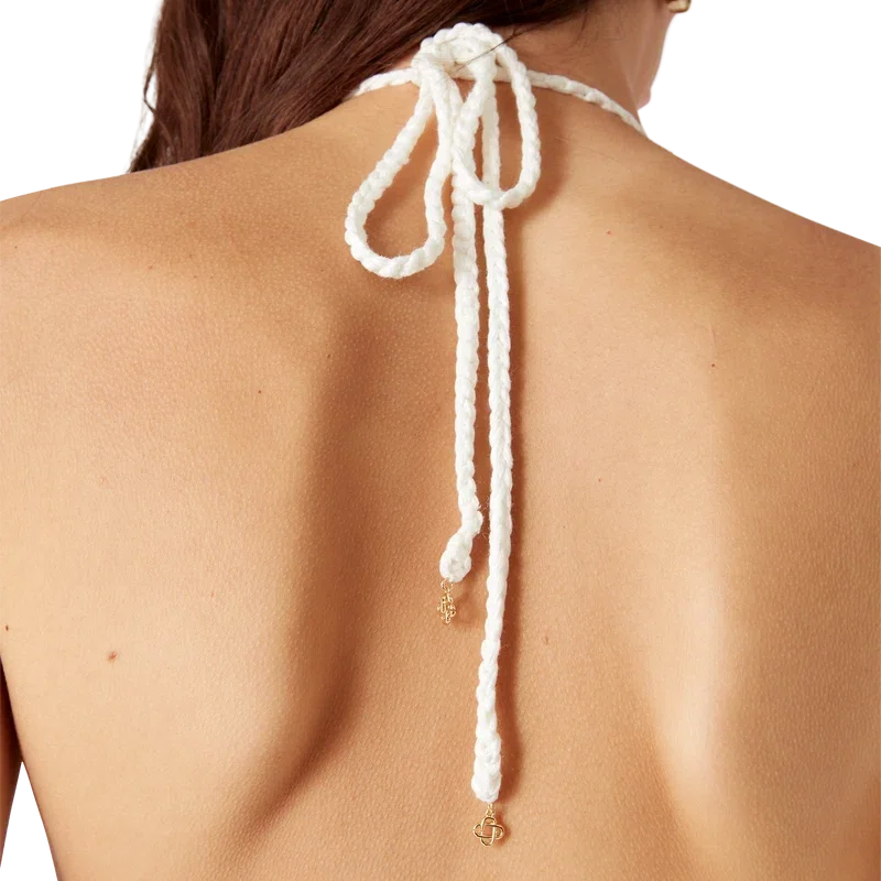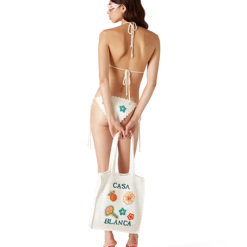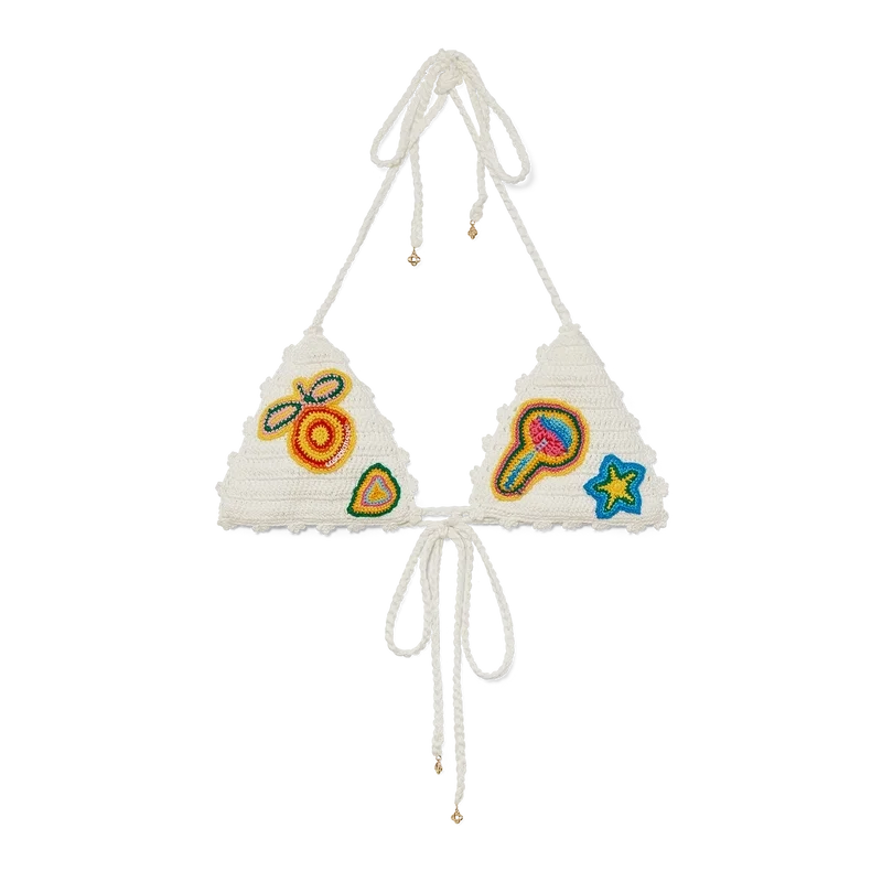Motif Crochet Bikini Top är en triangulär bikini-top tillverkad av virkat tyg. Den är utsmyckad med motiv från husets klassiska designelement och har snörning i nacken och på ryggen. Denna modell har avtagbara vadderingar och är avsedd att bäras tillsammans med matchande bikinibottnar.