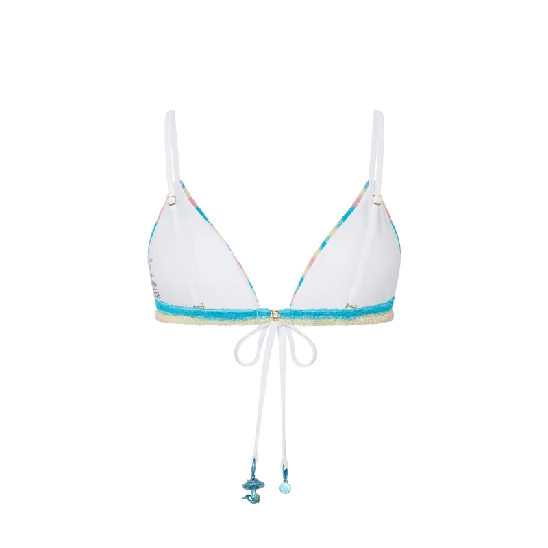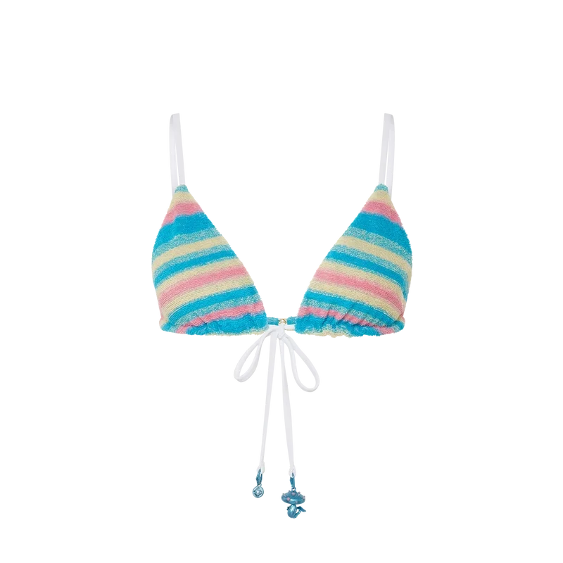Den randiga bikinitoppen i frotté är tillverkad av frottétyg och pryds av husets guldpläterade sammanlänkade CC-nitar. Den kompletteras med en kontrasterande dragsko i nacken och på ryggen och avslutas med husets säsongsbetonade svamp- och CC-logotypberlocker.