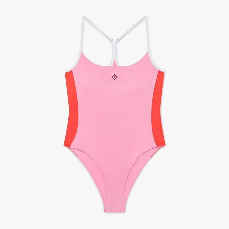 Den rosa monogrambaddräkten är en elegant hel baddräkt med husets signaturmönster i en livfull färgkombination av rosa, rött och vitt. Den har rund halsringning, vita justerbara axelband, röda sidopaneler, högt skurna ben och husets signaturdiamantlogo på bröstet.