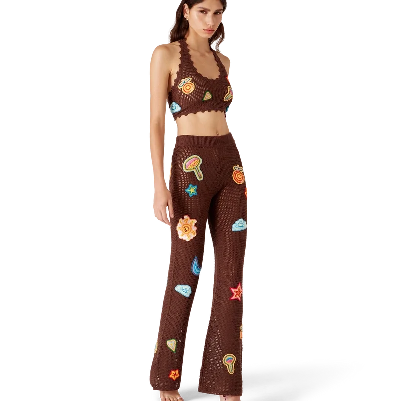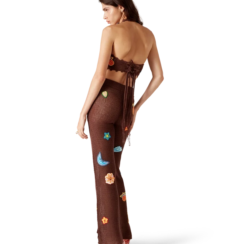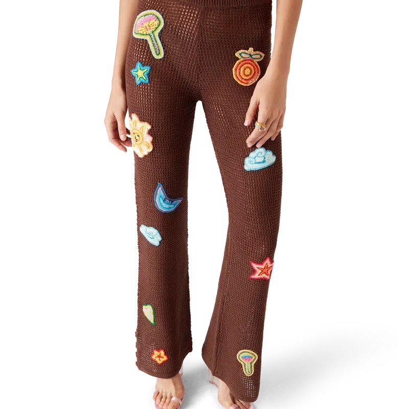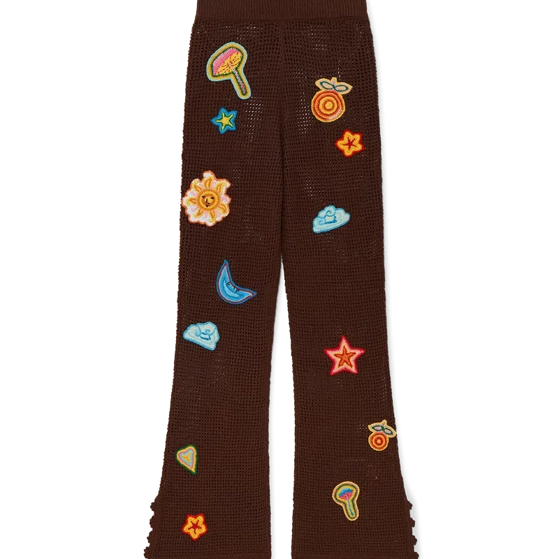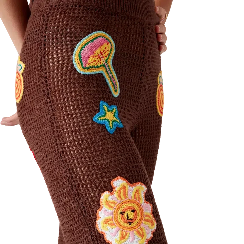 Motif Crochet-byxorna har en stickad design tillverkad av ett öppet vävt bomullstyg i virkat mönster. De har en elastisk midjeresår, motiv från husets klassiska designelement och slitsar vid anklarna.
