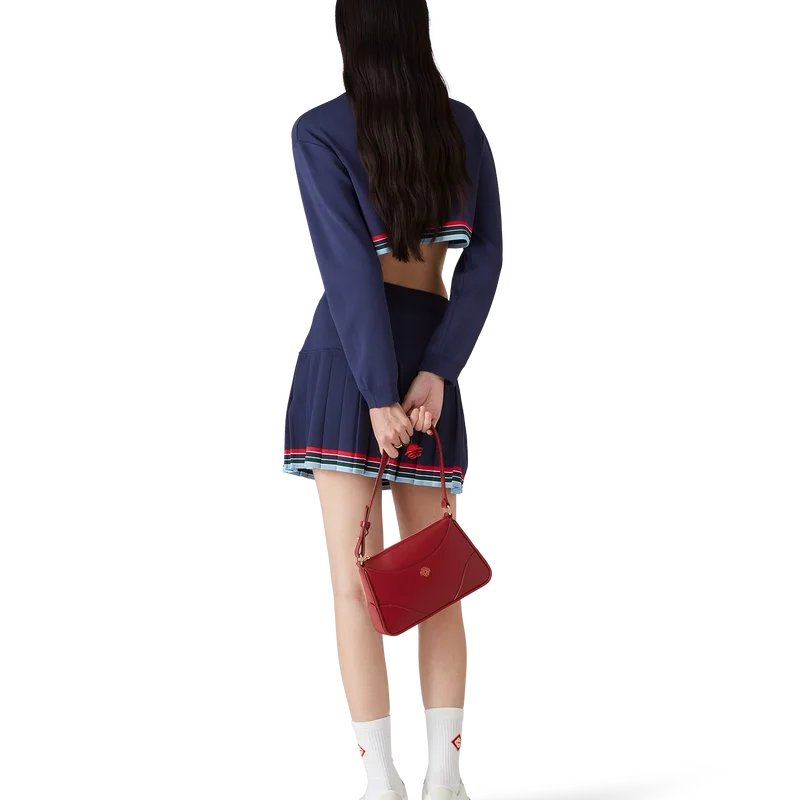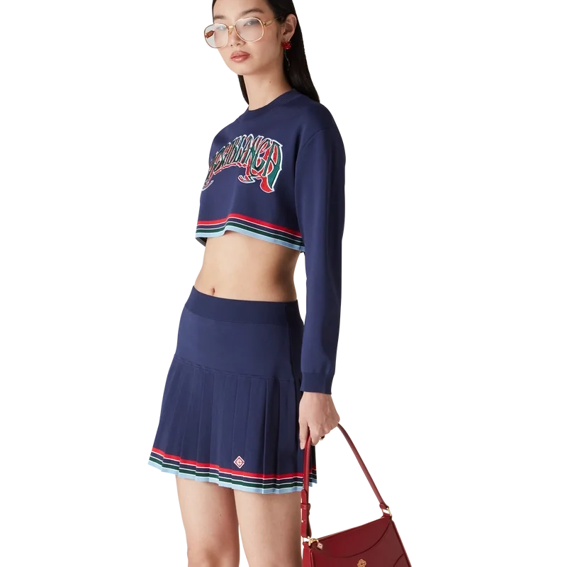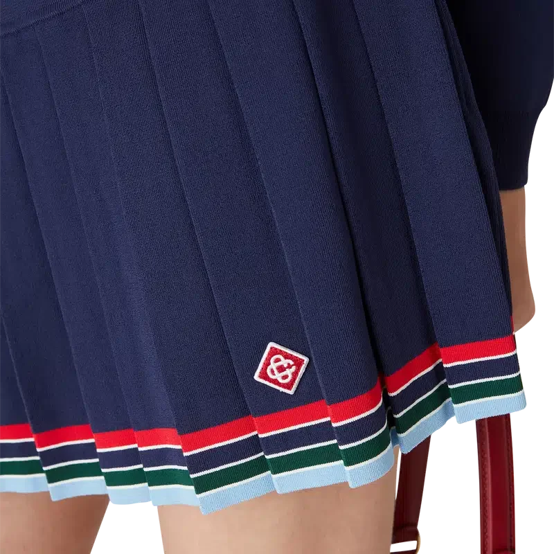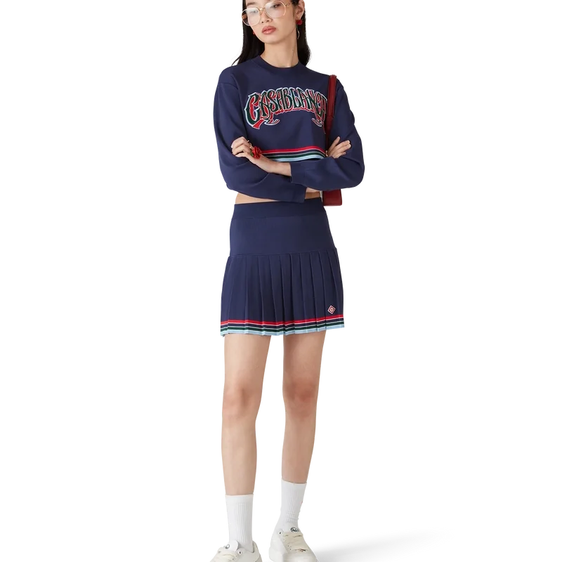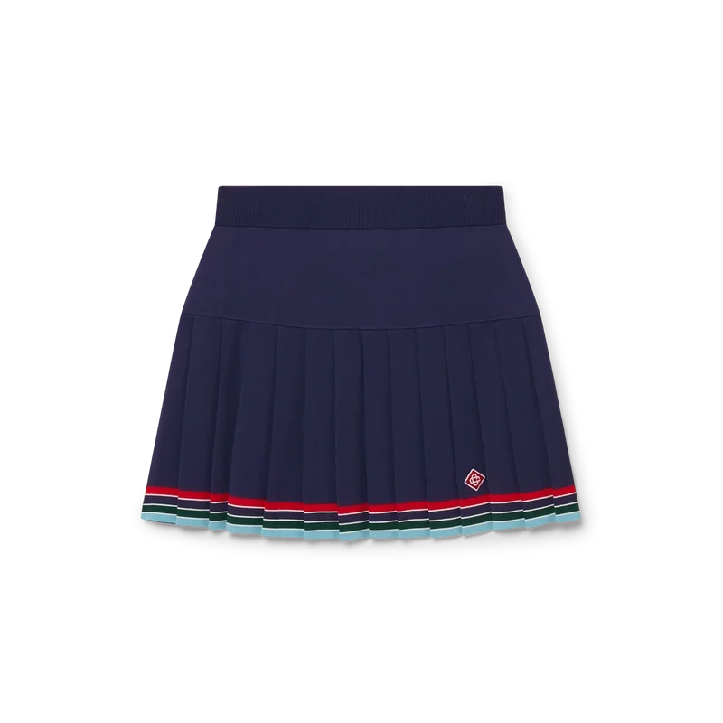 Baseball-plisserad kjol är en minikjol tillverkad av trikåtyg. Den har midjeband, veck och horisontella ränder i rött, vitt, blått, grönt och marinblått i nederkanten.