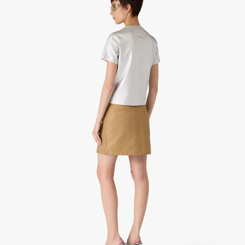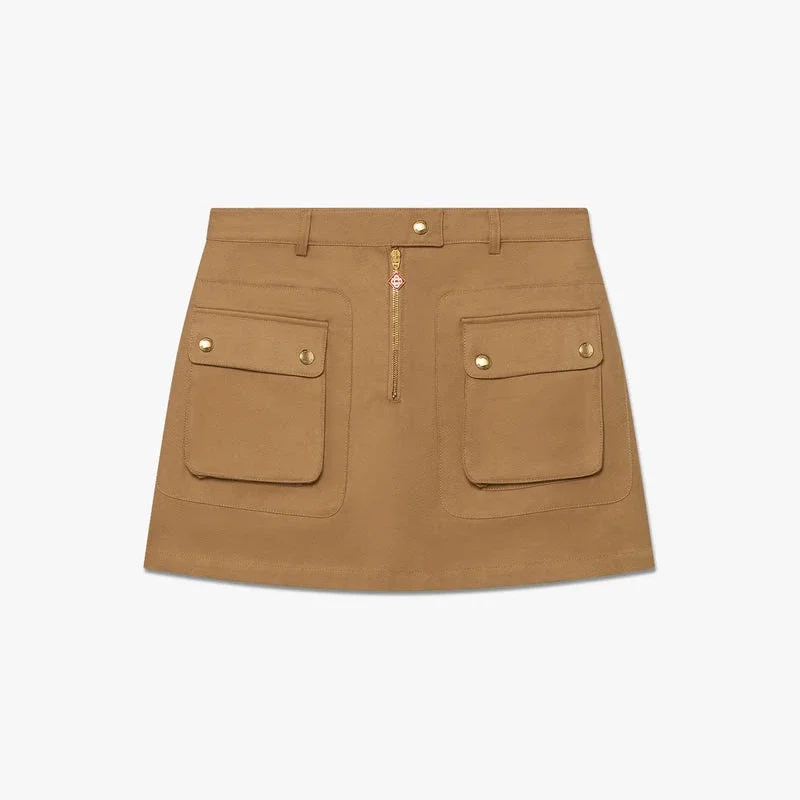 Den beige minikjolen i bomull med fickor har en elegant A-linjeformad design och är tillverkad av slitstarkt bomullsdrilltyg i en varm beige nyans. Den har midjeband, hällor, dragkedja, guldpläterade detaljer, funktionella påsydda fickor och en strukturerad silhuett.