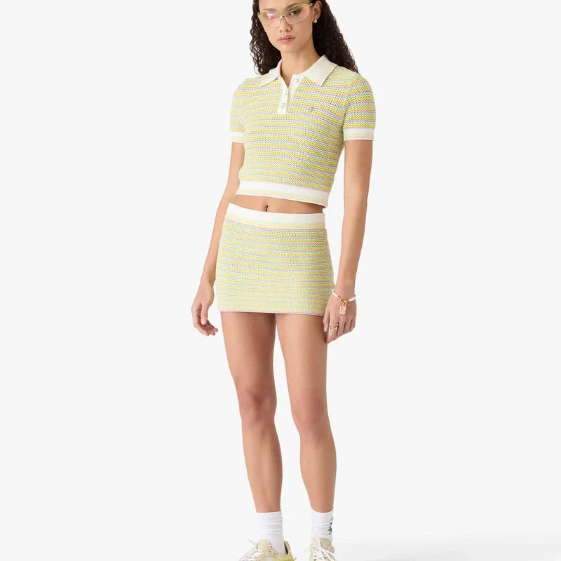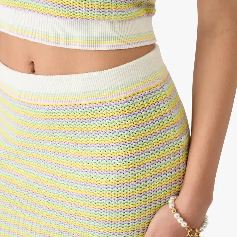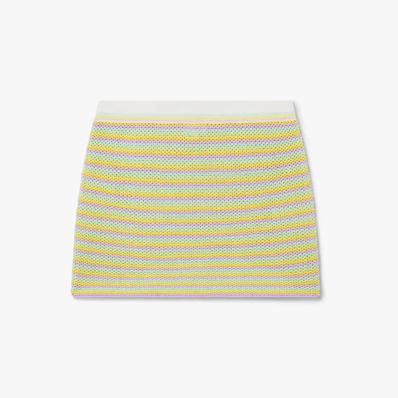 Den randiga minikjolen Bourgeois är en raffinerad A-linjeformad stickad modell med märkets Warped-logotyp. Den har en elastisk midjeresår med ribbade detaljer och eleganta ränder över hela kjolen.