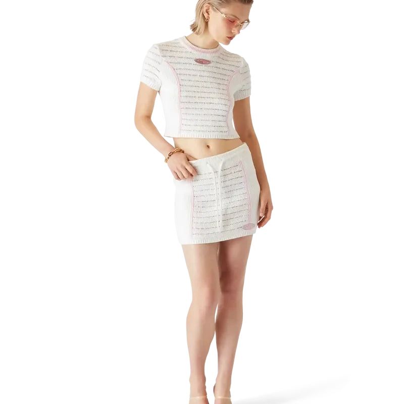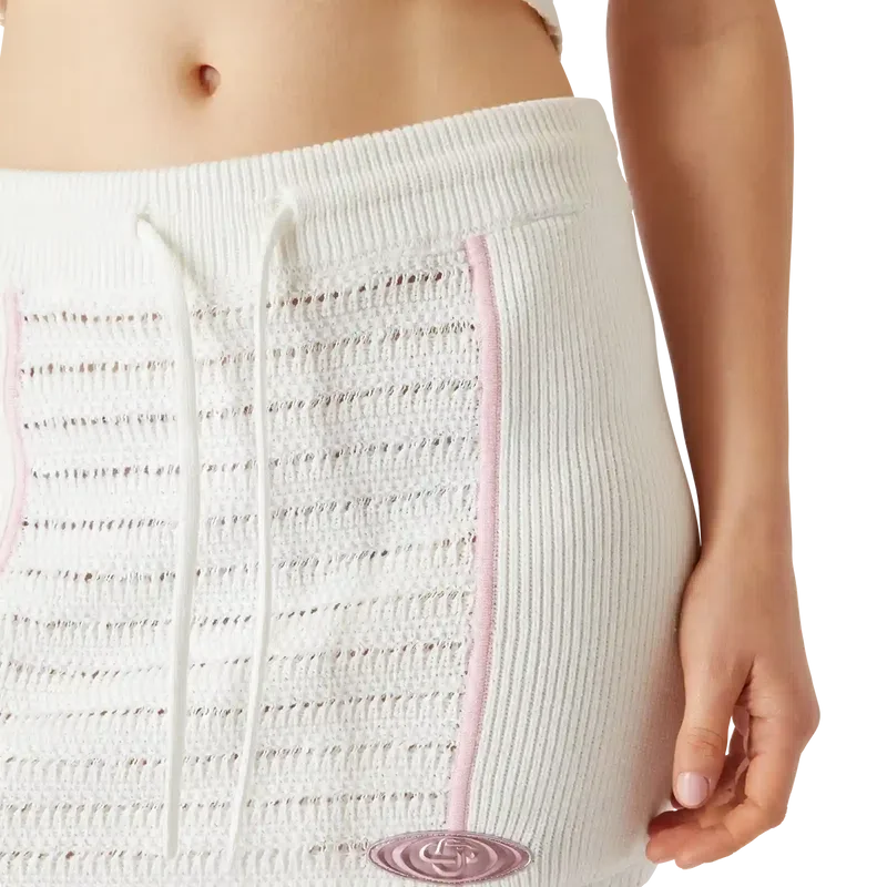 Bourgeoisie Girl-kjolen är designad med en lätt A-linjeformad fåll och pryds av märkets Warped-logo med en glasliknande effekt. Plagget är designat för att bäras tillsammans med den matchande Bourgeoisie Girl-toppen och speglar en precis konstruktion med en förfinad sport- och fritidskänsla. Avslutas med ett elastiskt midjeband, dragsko, kontrastsömmar och ribbade sidopaneler.