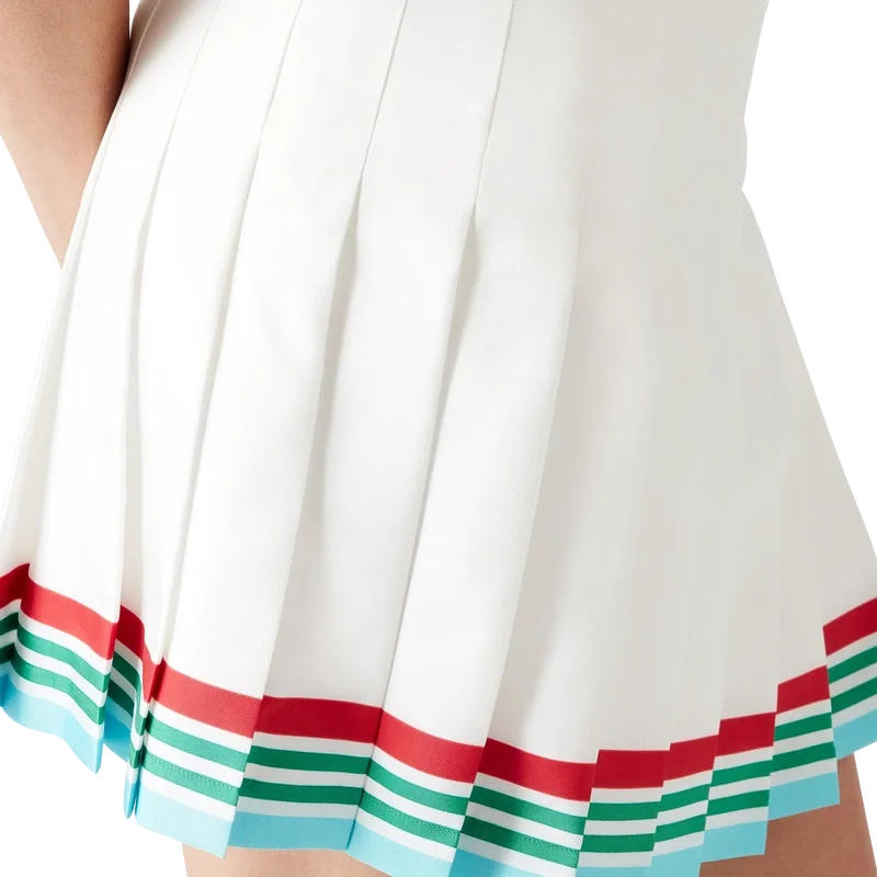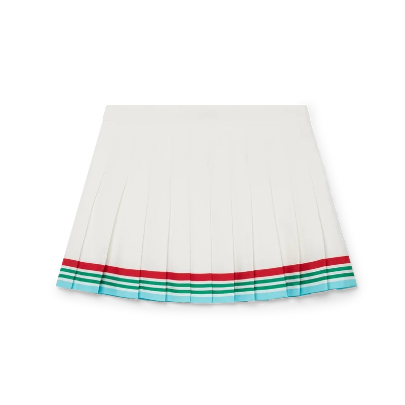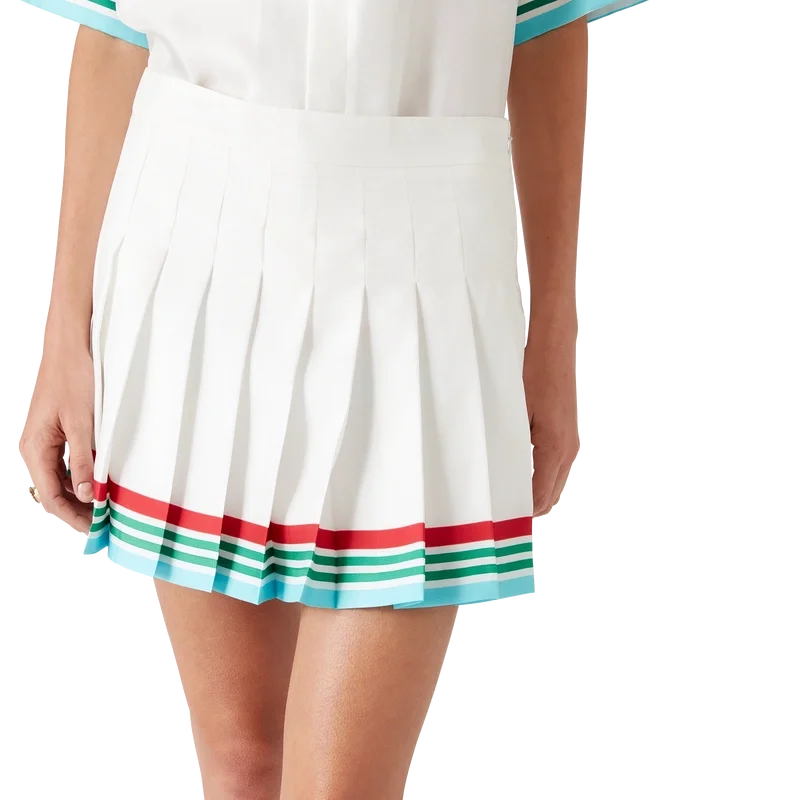 Casa Way World Series veckad kjol är en minikjol tillverkad av silkestwill. Den har en slät midjeresår, veckad panel, en horisontell randig kant i rött, vitt, grönt och blått, dragkedja i sidan och foder.