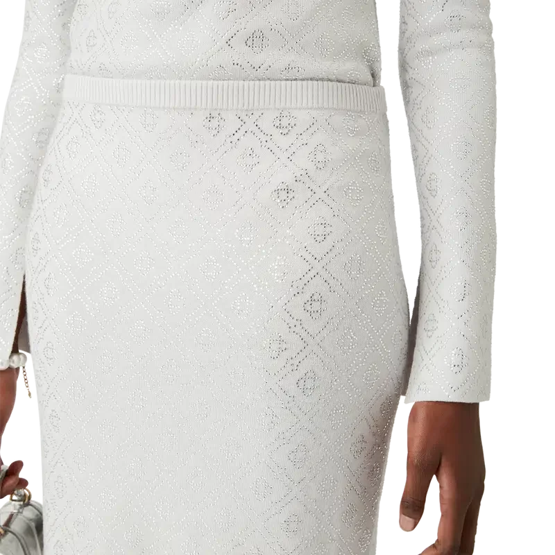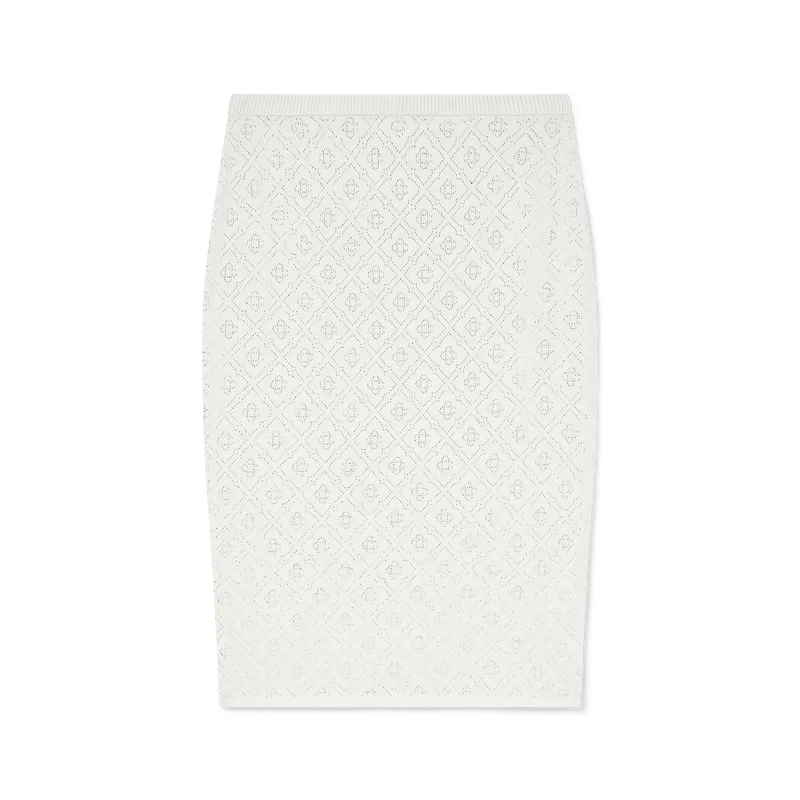 Crystal Monogram Knit Skirt är en midilång kjol tillverkad av merinoull med husets Crystal Monogram. Avslutas med en elastisk midjeresår.