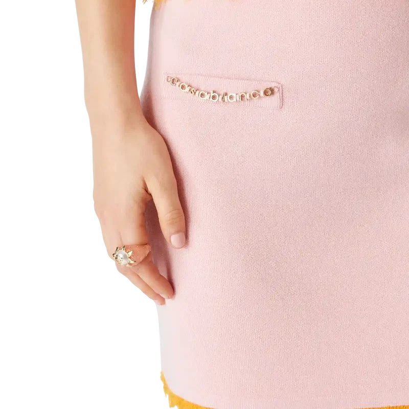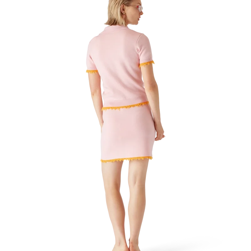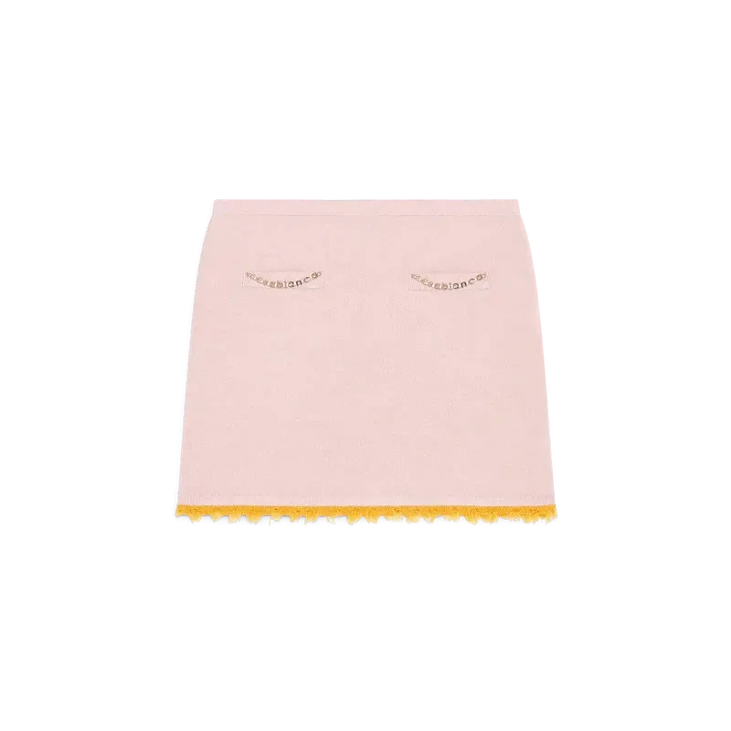 Merino-minikjolen har en figursydd design i merinoull med A-linjeformad silhuett. Den har passpoalfickor och slitna kanter.