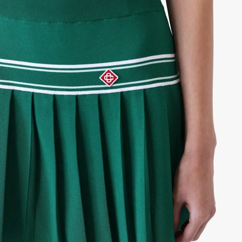 Den gröna plisserade stickade minikjolen har en raffinerad design med husets signaturdiamantlogo. Kompletterad med en okdel med randdetaljer och en plisserad panel med horisontella randdetaljer i nederkanten för en feminin silhuett.
