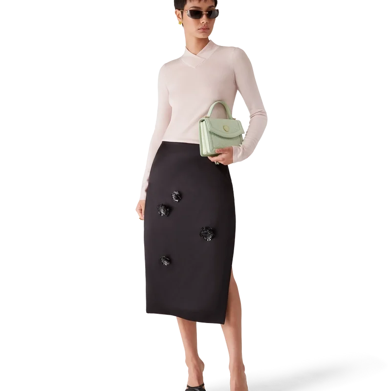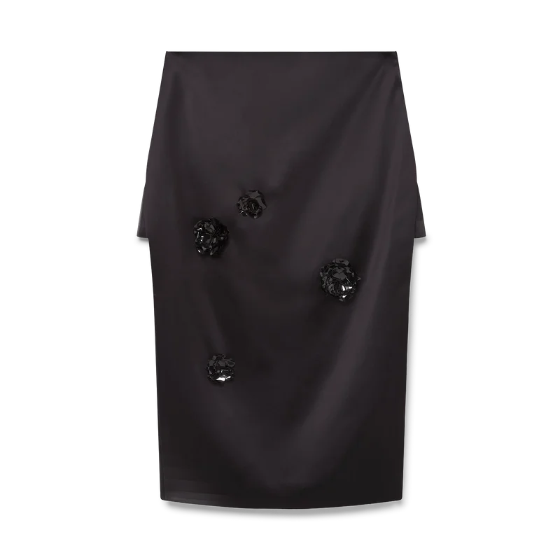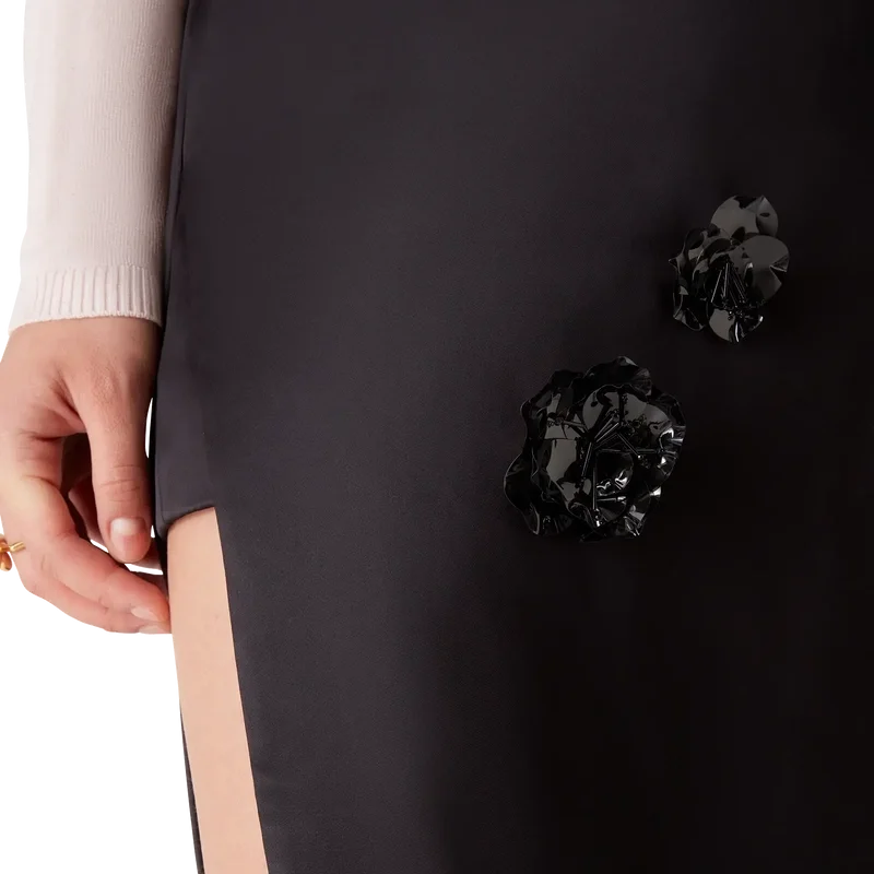 Midi-kjolen i duchesse-satin är en midilång modell tillverkad av polyestertyg. Den har slitsar i sidorna, en miniunderkjol, dragkedja och avtagbara broderade blommotiv.