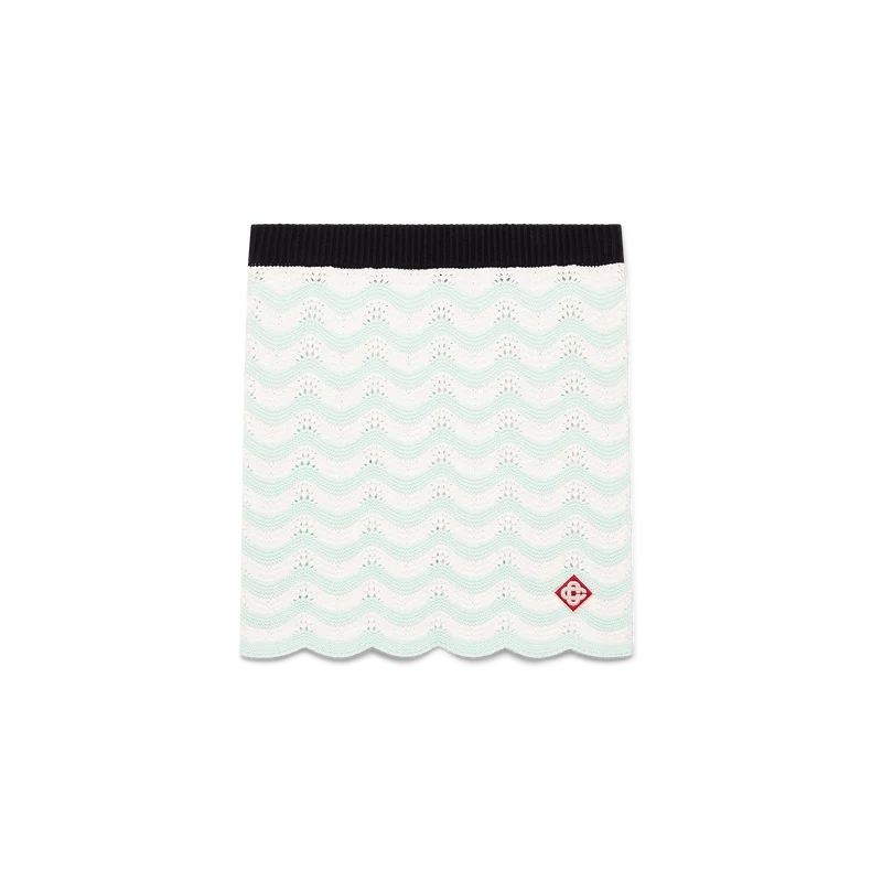Den virkade minikjolen i bomull är en figursydd modell med husets signaturdiamantlogotyp, tillverkad av virkat bomullstyg. Avslutas med en svart kontrasterande elastisk midjeresår och våginspirerad fåll.