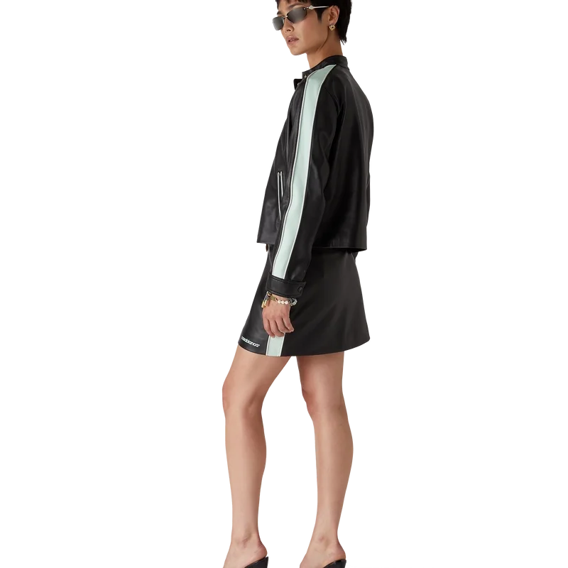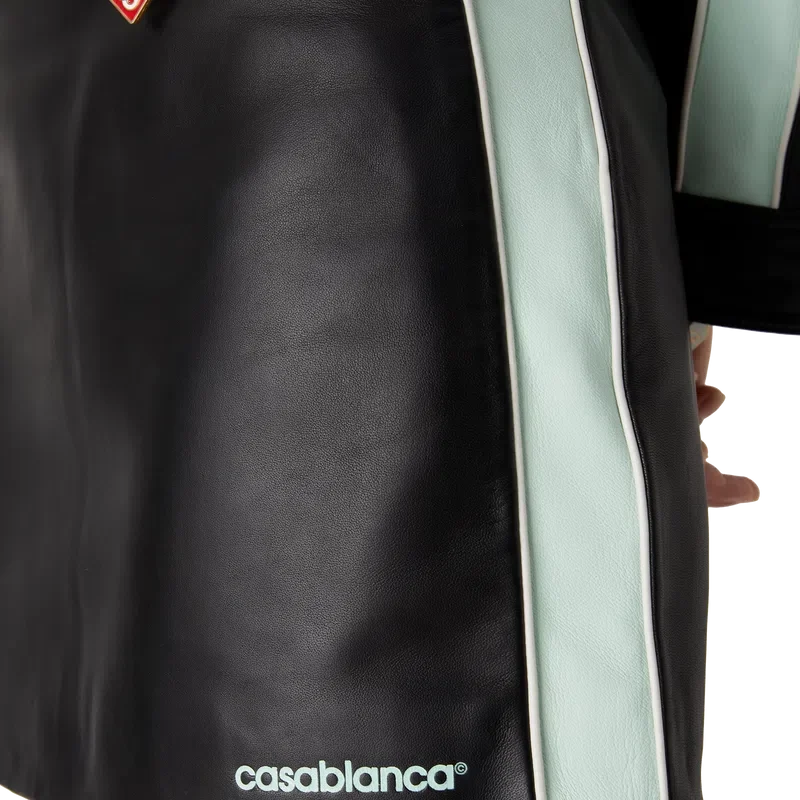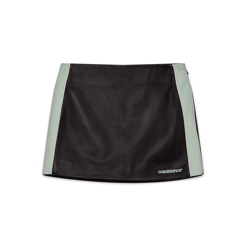 Leather minikjolen är en figursydd minikjol tillverkad av lammnappa. Den har midjeband, randiga detaljer längs sidorna och märkets Casablanca-logotyp i nederkanten.
