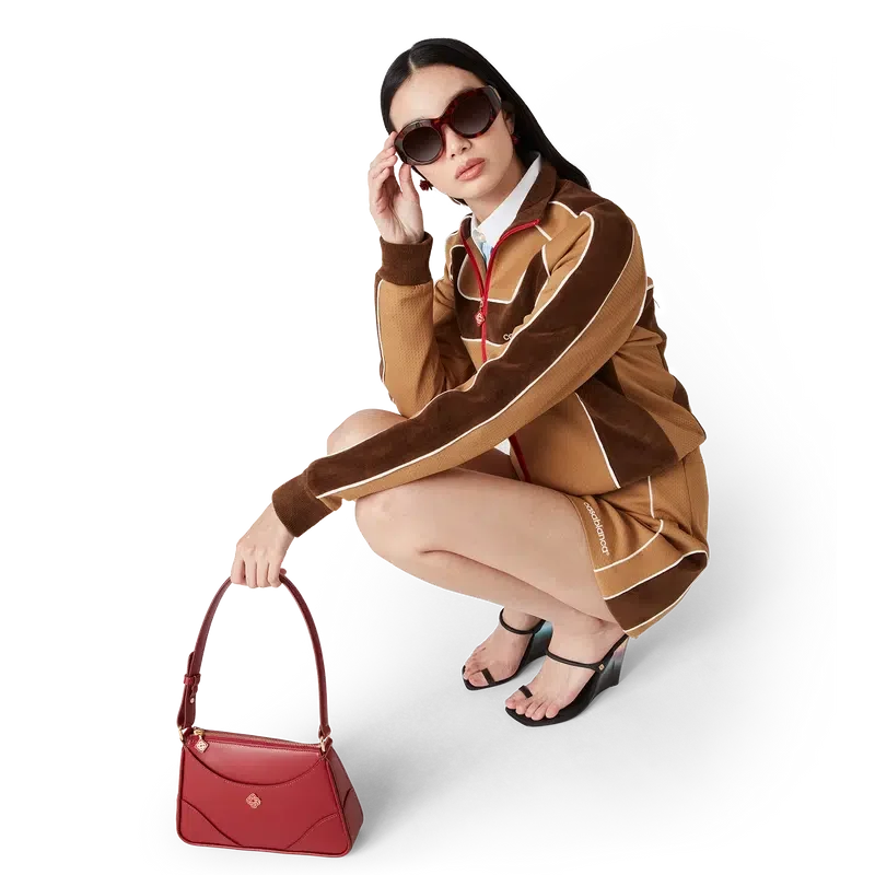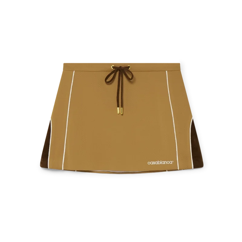 Minikjolen med chenillepaneler är en sportinspirerad design tillverkad av tekniskt velourtyg och prydd med husets Casablanca-logotyp. Den kompletteras med en elastisk midjeresår, dragsko med guldspetsar och sidopaneler med vita kantband.