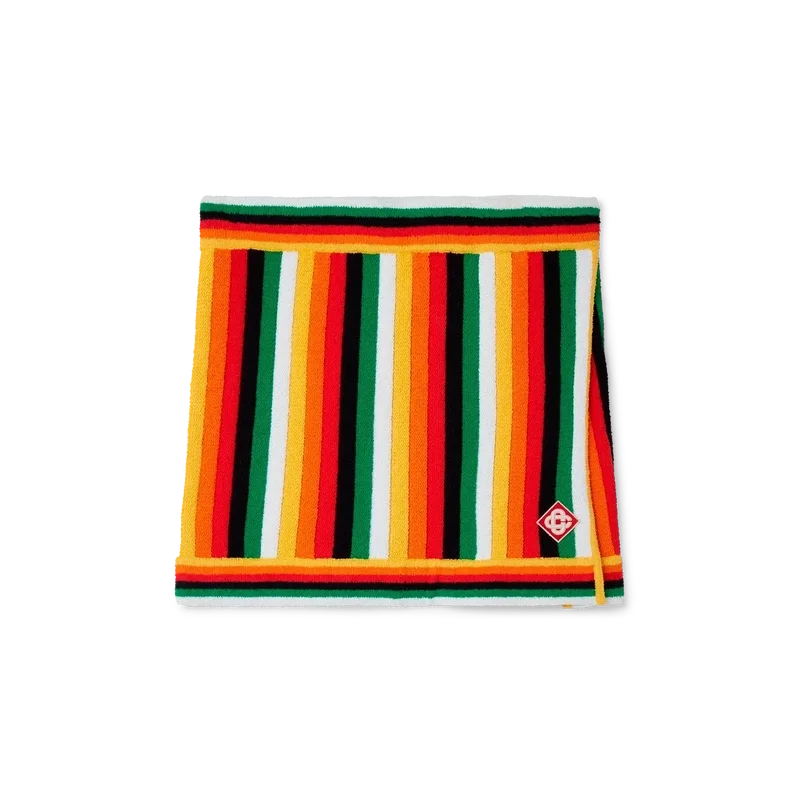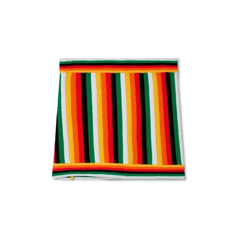 Den randiga frottékjolen är en minikjol i ett randigt 3D-frottétyg av bomullsblandning, med säsongens färger och husets signaturdiamantlogo. Avslutas med en slits och horisontella ränder på det elastiska midjebandet och fållen.