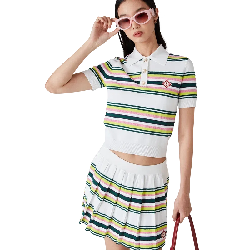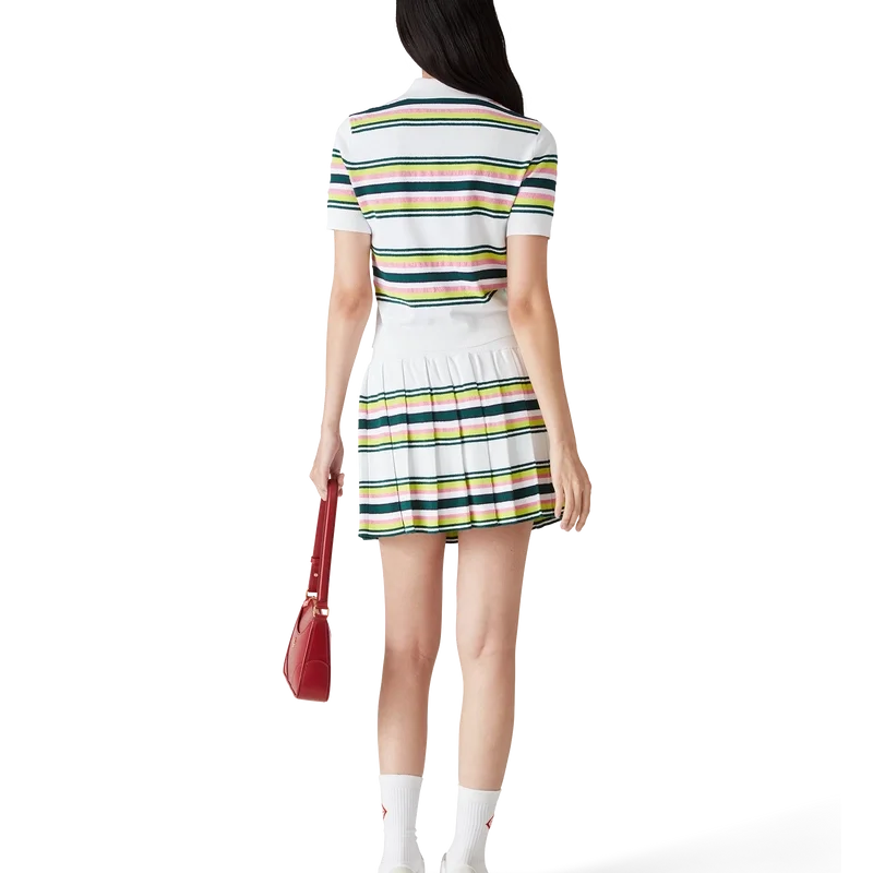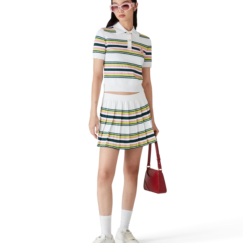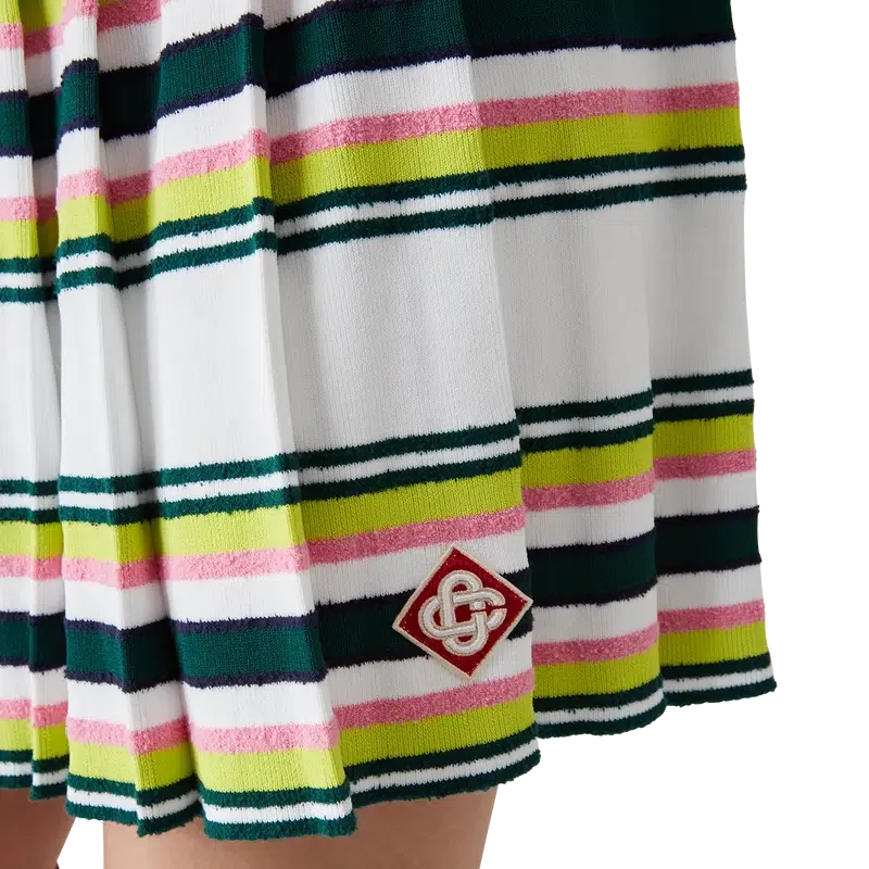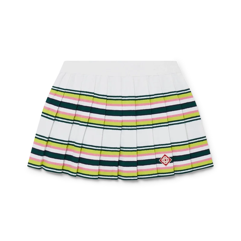 Den randiga plisserade kjolen är en minikjol tillverkad av ett randigt tyg. Den har resår i midjan, veck, gröna, rosa och blå horisontella ränder, dragkedja i sidan och inbyggda shorts.