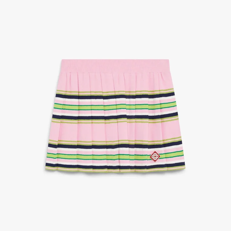 Den rosa och gröna randiga plisserade minikjolen är en raffinerad stickad design tillverkad av ett mjukt viskosblandat tyg, med eleganta plisseringar och husets signaturdiamantlogo. Kompletterad med elastisk midja, veck, gröna, rosa och blå horisontella ränder samt inbyggda shorts.