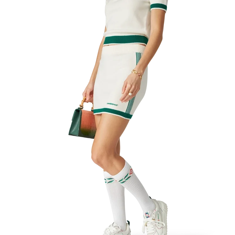 Den stickade tenniskjolen är en figursydd minikjol tillverkad av merinoull. Den har en elastisk midjeresår, kontrasterande kantdetaljer i nederkanten, randiga detaljer längs sidorna och Casablanca-logotypen. Vit/grön