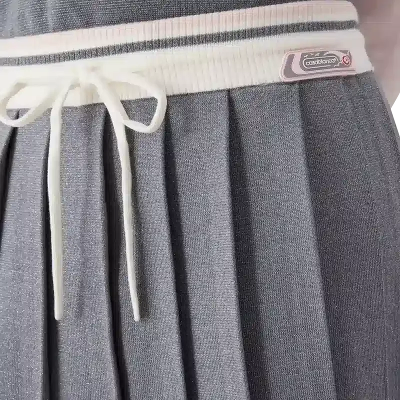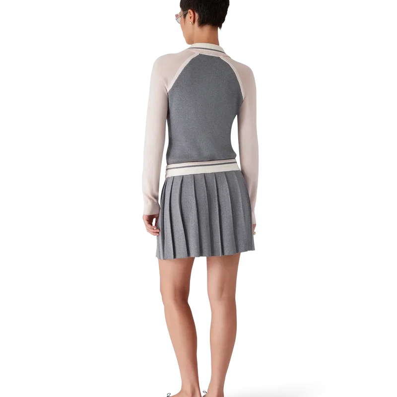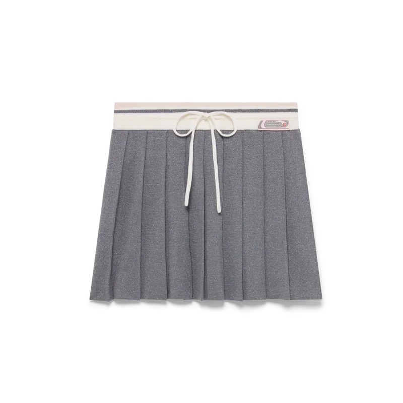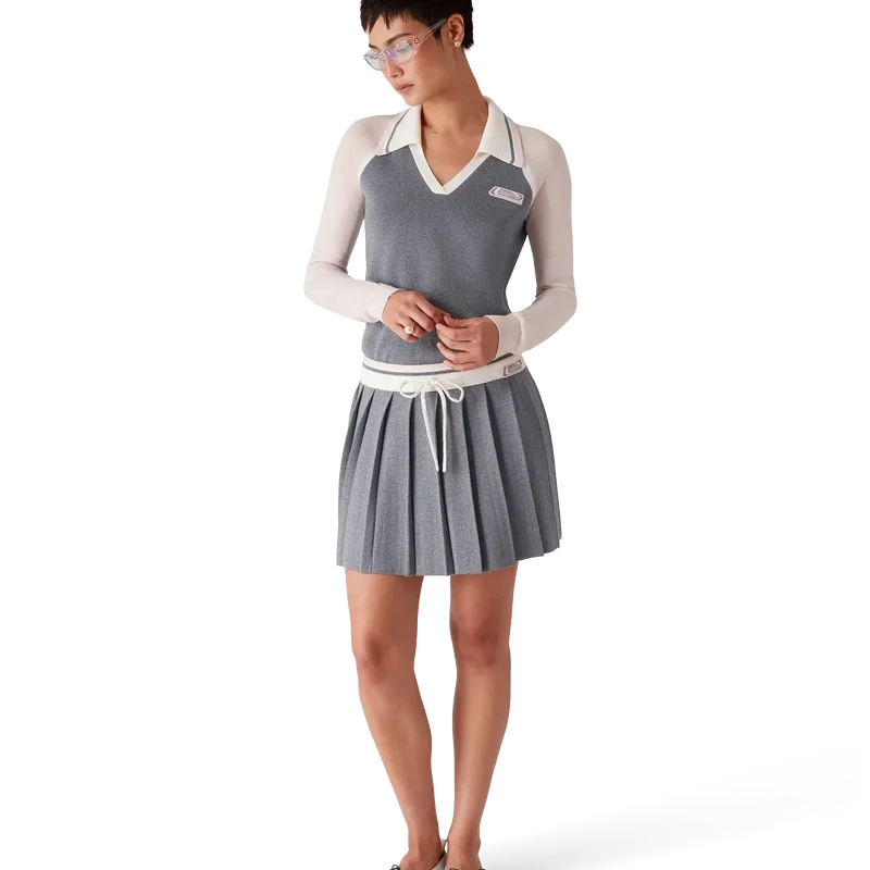 Merino-stickad tenniskjol är en klassisk modell tillverkad av merinoull. Den har ett veckat ok, en kontrasterande ribbad midjeresår och dragsko.