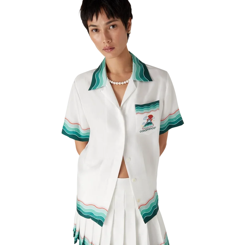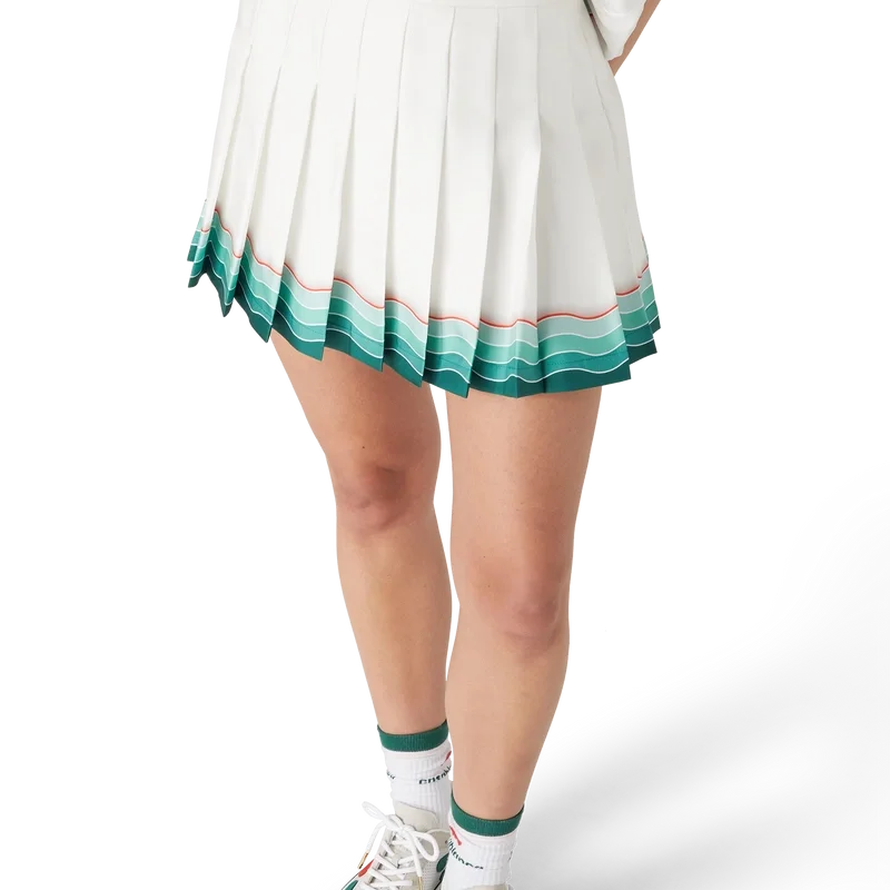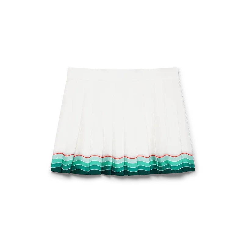 Den plisserade minikjolen i silke är en klassisk design tillverkad av silketwill. Den har midjeband, dragkedja, foder och en våginspirerad randig kant i Memphis-stil.