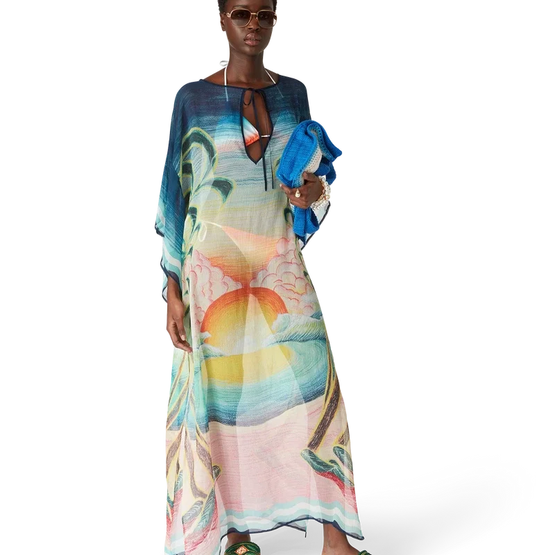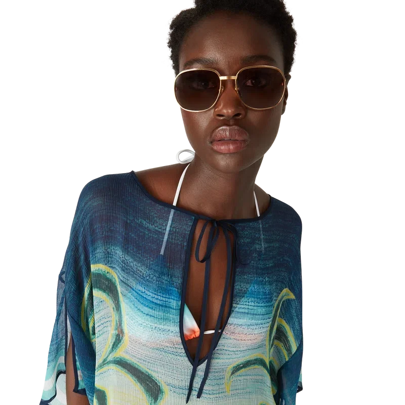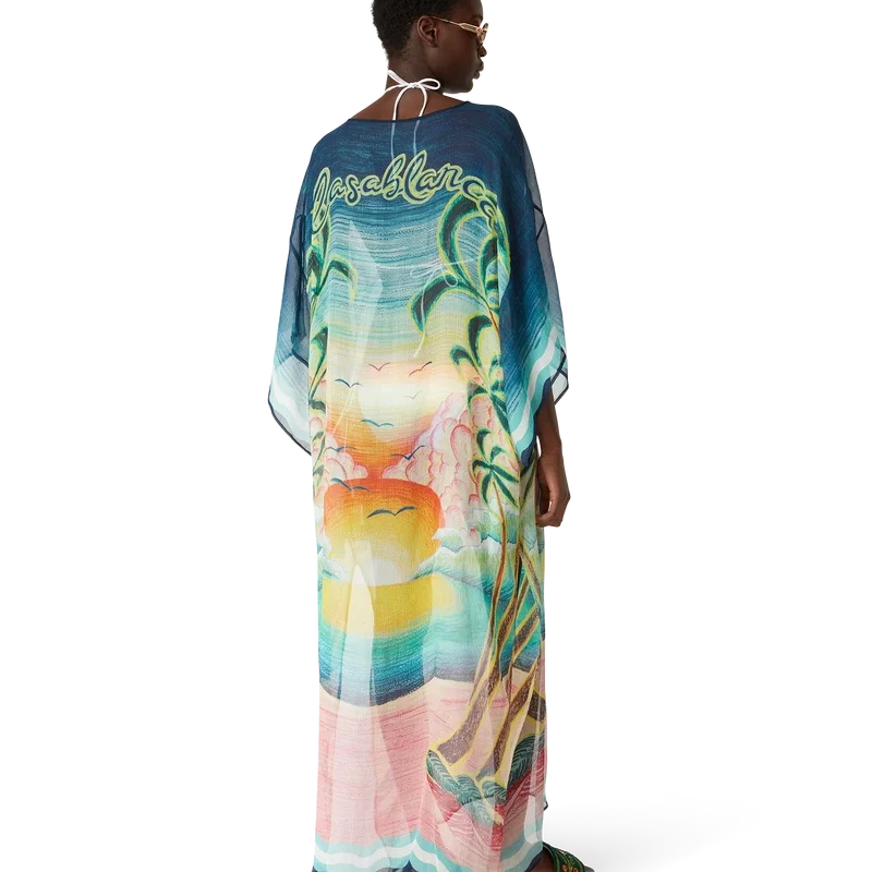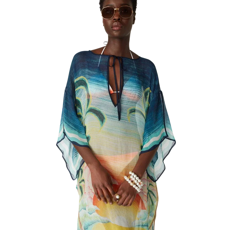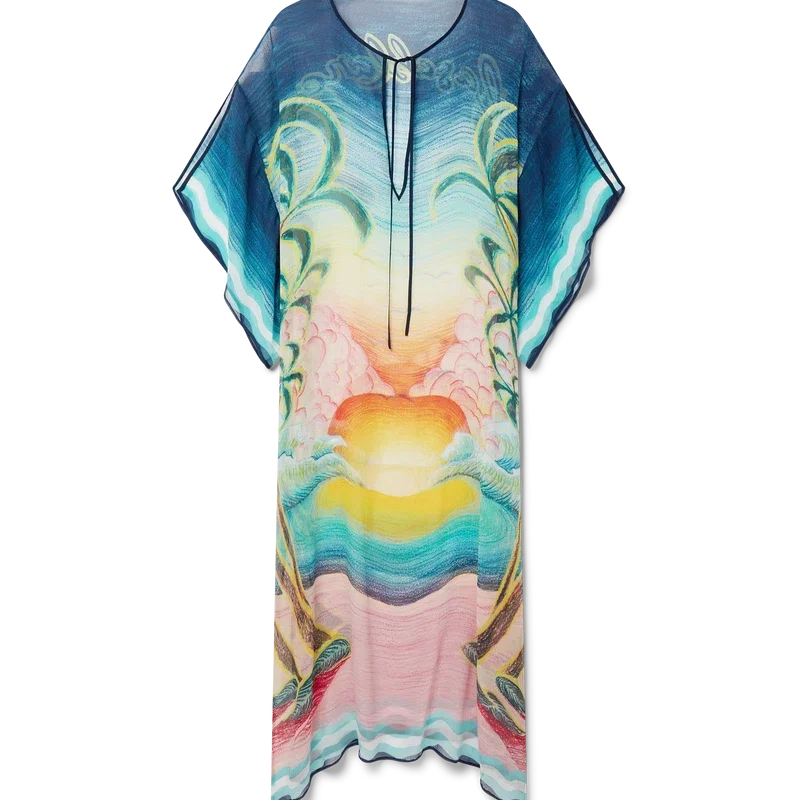 Danse De La Mer Kaftan är en löst sittande, lätt design tillverkad av tryckt sidenväv med handmålade motiv skapade speciellt för kollektionen. Kompletterad med vida ärmar, sidoslitsar och en V-ringning med snörning.