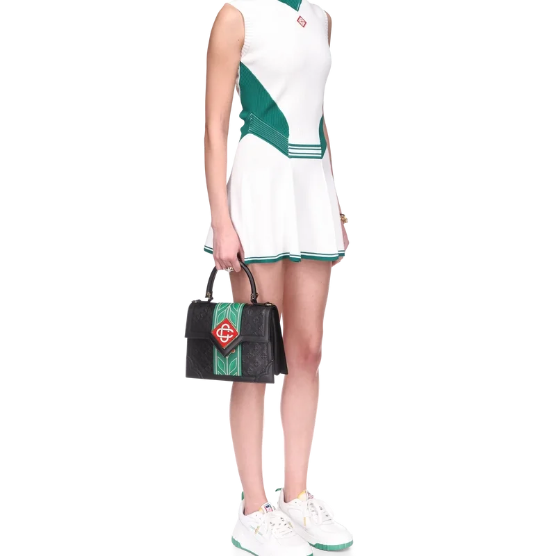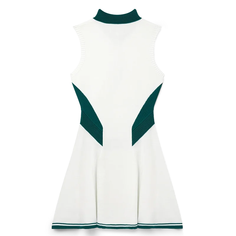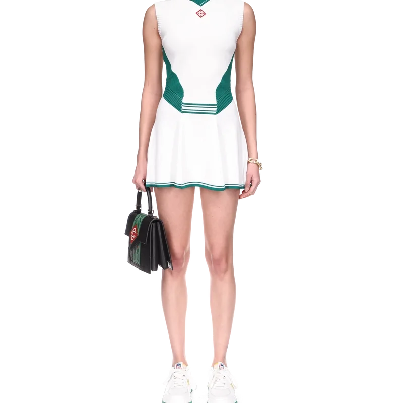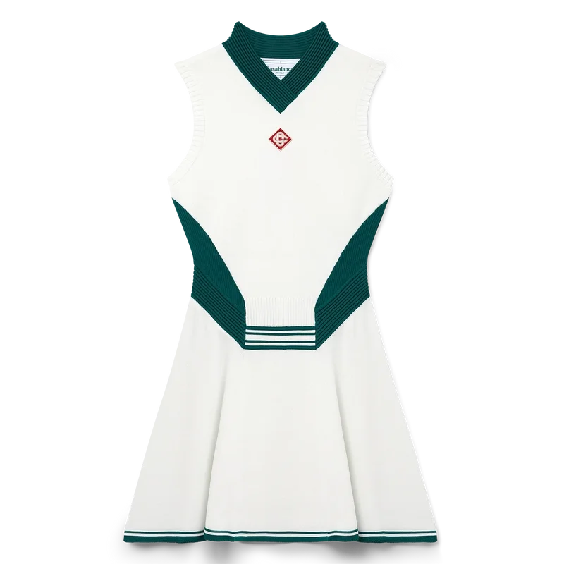 Den draperade tennisklänningen är en ärmlös modell med hög V-ringning inspirerad av tennis och tillverkad i ett stickat tyg med husets signaturdiamantlogo på bröstet. Avslutas med ett figursytt liv, en sänkt midja, en panelerad kjol med kontrasterande fåll, kontrasterande ribbdetaljer på kragen, sidopaneler och midjeband.