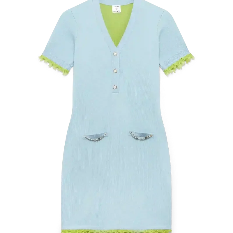 Den har en djup V-ringning, knäppning, paspolerade fickor, signaturknappar med guldkant och pärlor, ribbade muddar och fåll med fransade kanter samt en avslappnad passform.