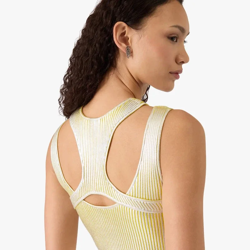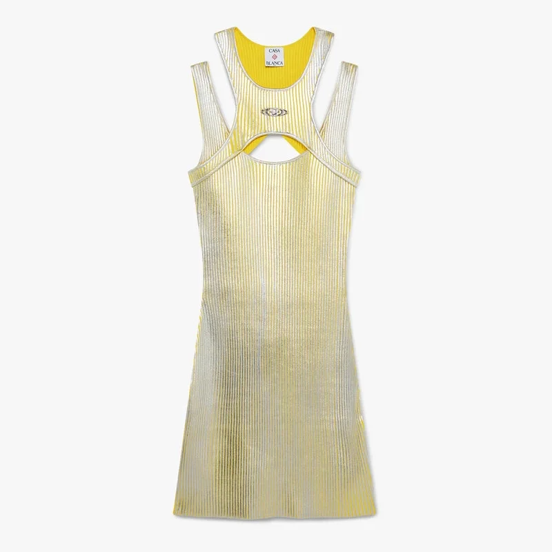 Den gula miniklänningen med folietryck är en ärmlös, elegant stickad modell med husets silverpläterade Warped-logotyp. Den kompletteras med en racerrygg och en smickrande minisilhuett som förkroppsligar husets designkoder.