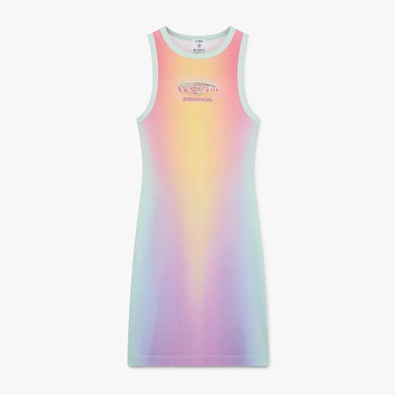 Glass Gradient Maxi Tank Klänning är en raffinerad design med säsongens Glass Gradient-motiv, skapat i samarbete med Martin Naumann, känd för sitt arbete med gradienter och textureffekter, med halvtoner och glasliknande effekter. Kompletterad med rund halsringning, ärmlös silhuett, husets Warped-logotyp och en Casablanca-logotyp med glasliknande effekt på framsidan.