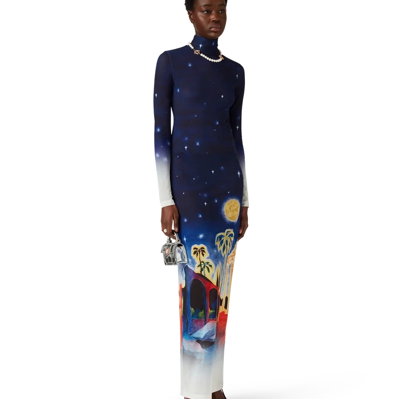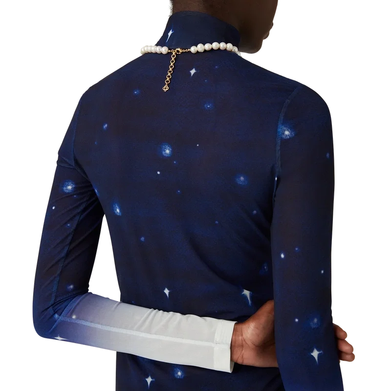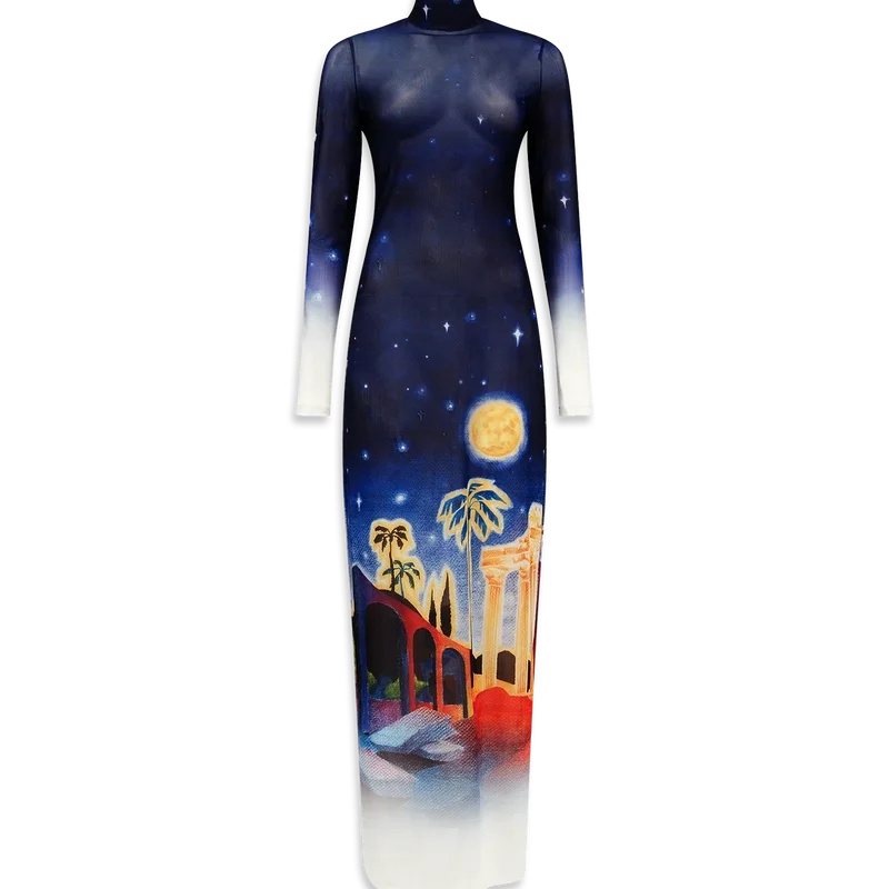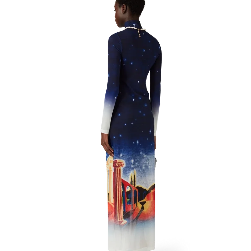 Midnight Acropolis Mesh Klänning är en långärmad klänning med heltryckt mönster, tillverkad i stretchigt mesh-tyg med husets säsongsbetonade tryck, som hyllar den vackra natten i det antika Grekland med ljuset från templet och himlen, kompletterad med en klassisk polokrage.