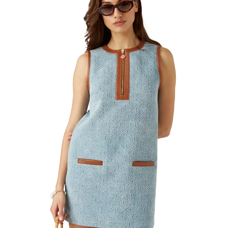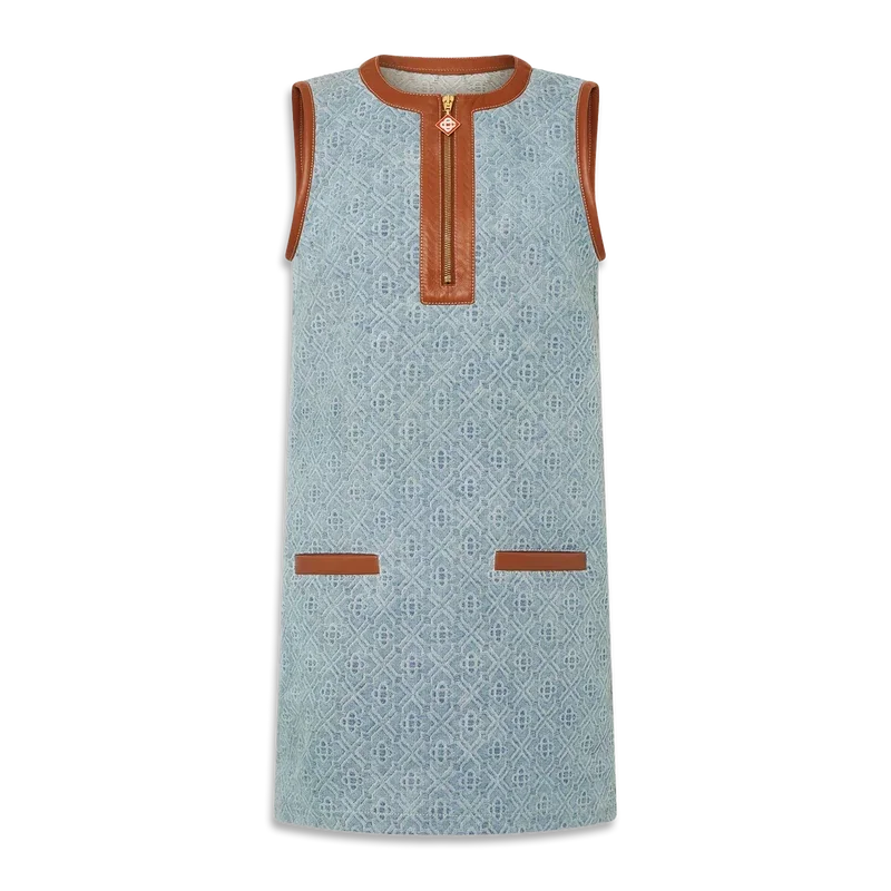 Monogram-jeansklänningen är en ärmlös miniklänning i shift-stil, tillverkad av ett denimtyg i bomullsblandning. Den har en korta dragkedja fram med den karakteristiska Monogram-dragkedjetappen, fickor med kantband fram, rund hals, ärmhål, hals, fickor och knäppning kantade med nappaläder – designad för en klassisk passform.