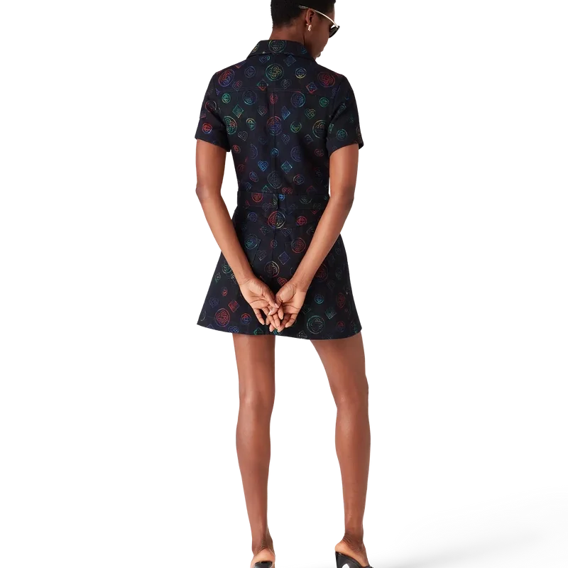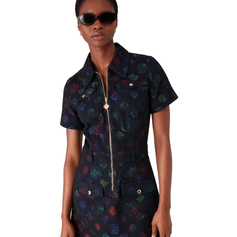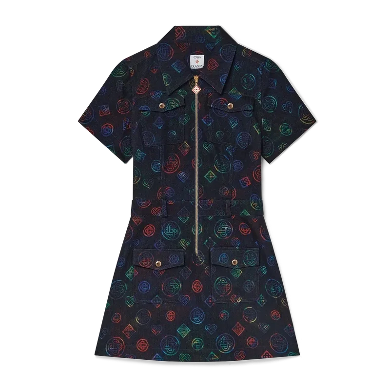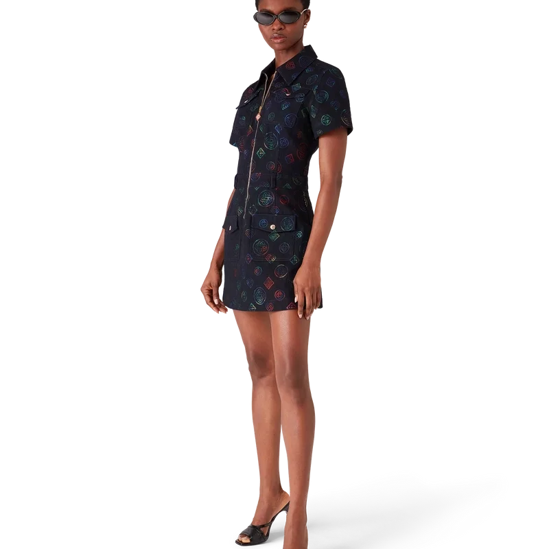Heatmap Monogram-jeansklänningen är en kortärmad A-linjeformad miniklänning, tillverkad av bomullsdenim med säsongens distinkta Heatmap-motiv. Den kompletteras med dragkedja fram med husets signaturdiamantlogotyp på dragkedjetappen, bälteshällor, fickor med lock och guldpläterade detaljer med märkeslogotyp.
