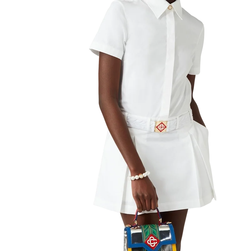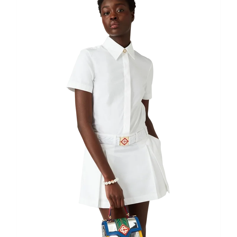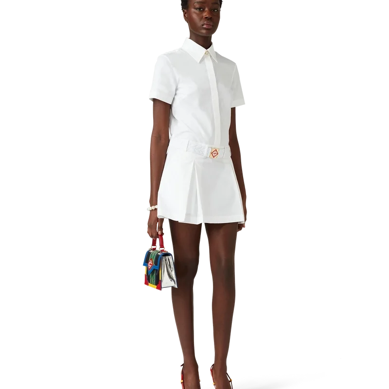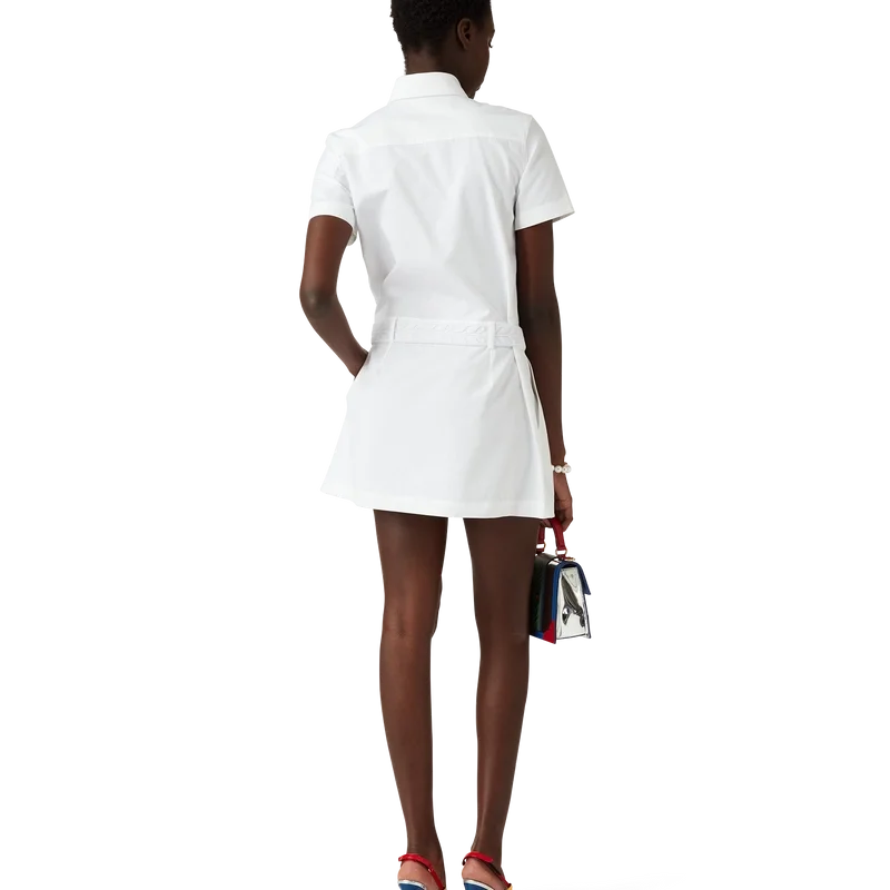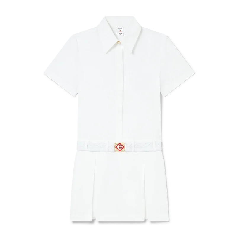 Den plisserade tennisminiklänningen är en kortärmad miniklänning med A-linjeformad silhuett, tillverkad i bomullstwill. Den har knäppning fram, öppen krage, bröstficka, midjeband och en invändigt plisserad kjolpanel.