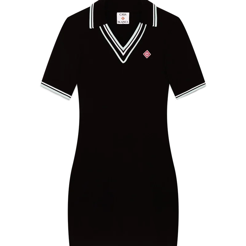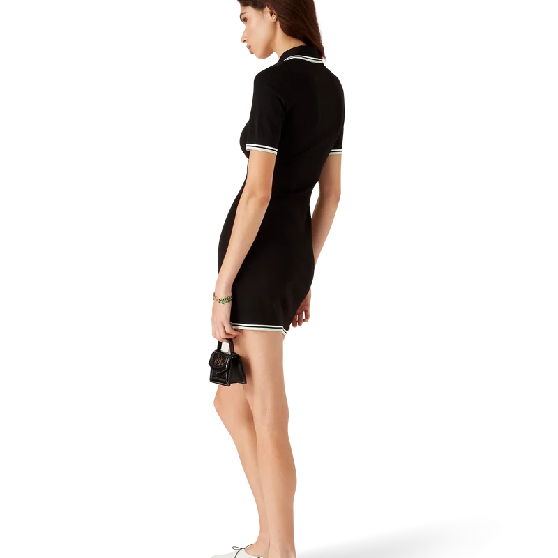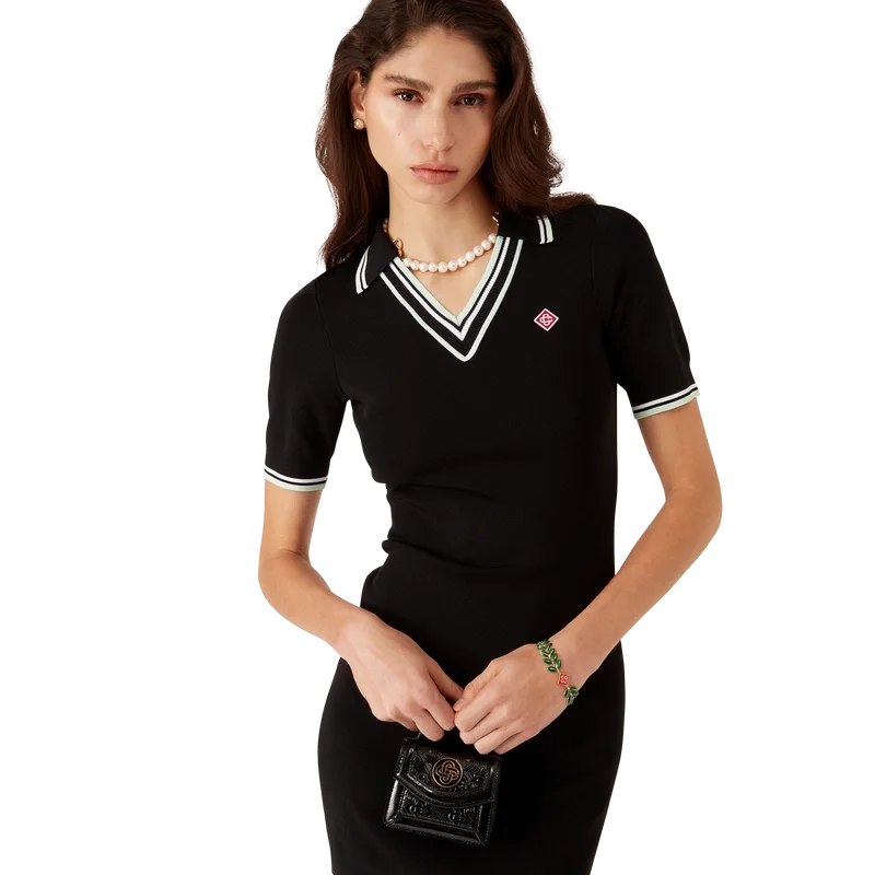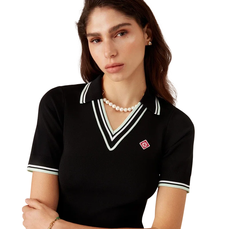 Pikétröjan i viskos med V-ringning är en kortärmad modell tillverkad i stickat tyg med märkets signaturdiamantlogo. Den har ribbad krage och detaljer i svarta, vita och mintgröna ränder på kragen, ärmsluten och fållen.
