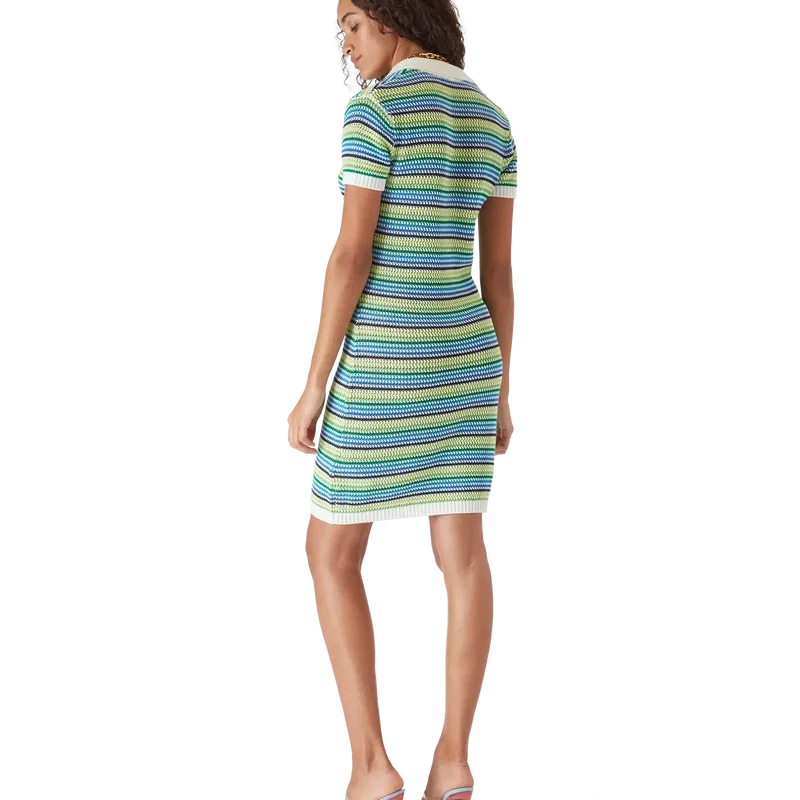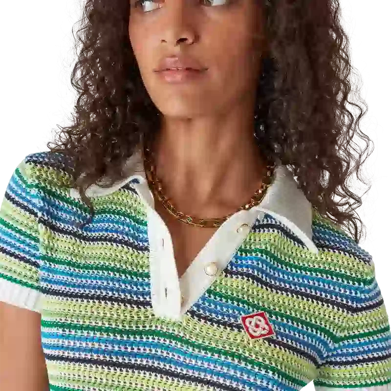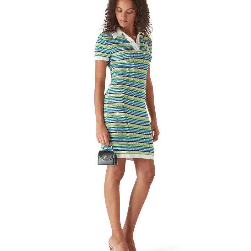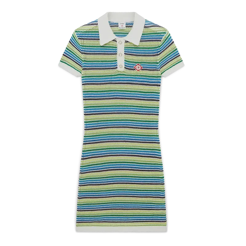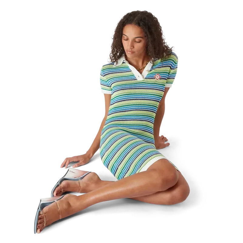 Den randiga klänningen är en miniklänning med husets diamantlogotyp på kragen, korta ärmar och midilängd. Den kompletteras med husets signaturrandmönster, diamantlogotypdetaljer och sofistikerad stickad finish som fångar raffinerad elegans.