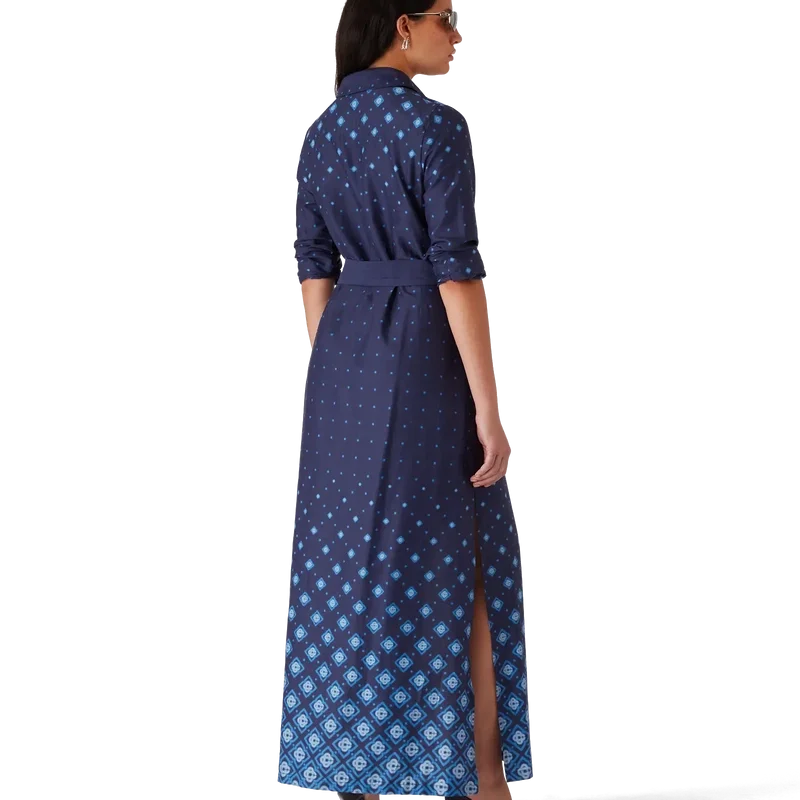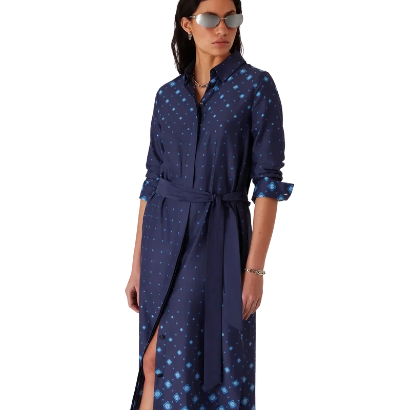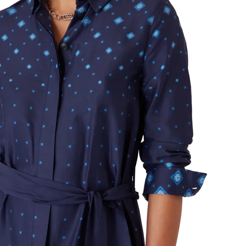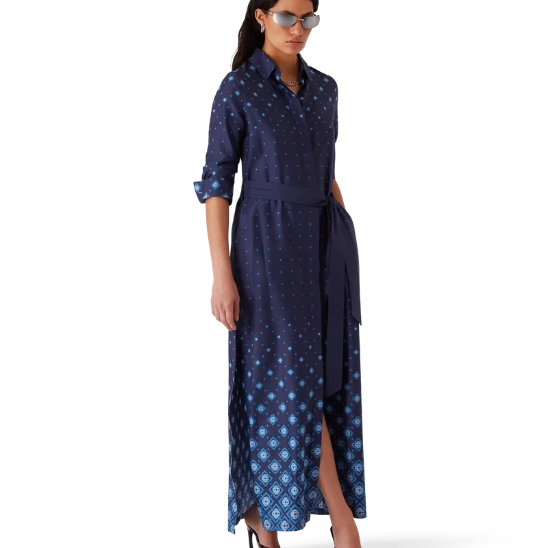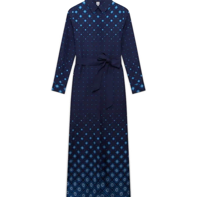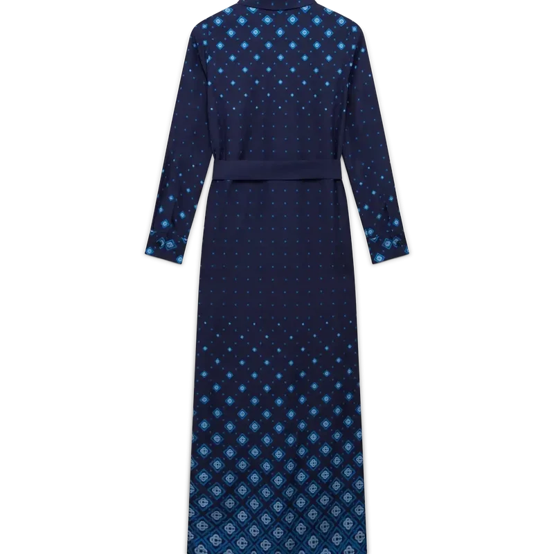 Den gradientfärgade silkeskjortklänningen är en långärmad, helfigurig klassiker med husets signaturmönster i gradient, där tonala övergångar flödar över hela silhuetten. Kompletterad med spetskrage, knäppning, sammankopplade Cc-logotypknappar i corozo, bälteshällor, ett ton-i-ton-textilbälte samt guldkantade emaljknappar vid krage och manschetter.