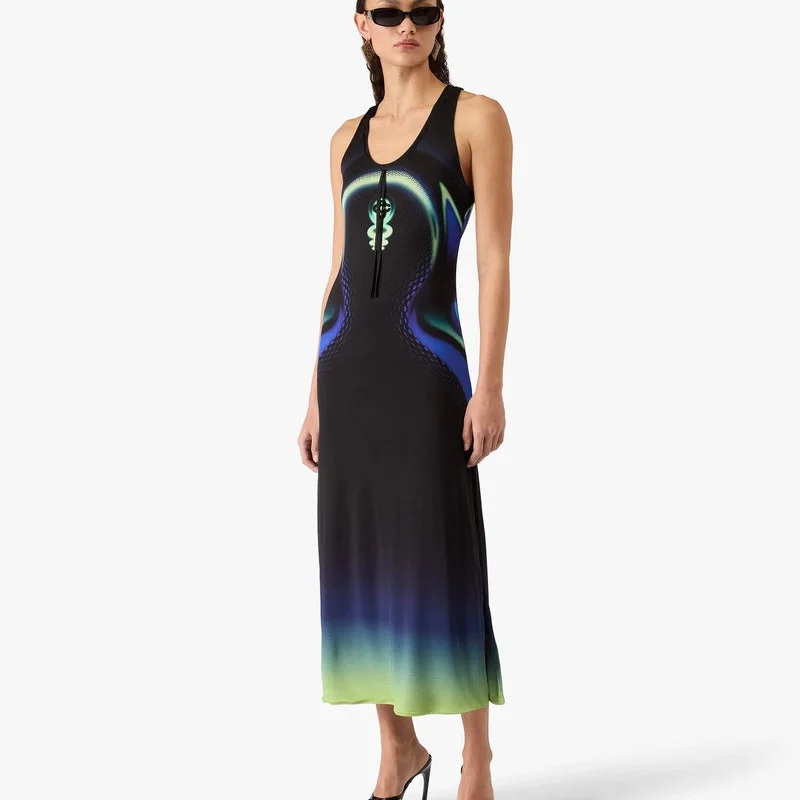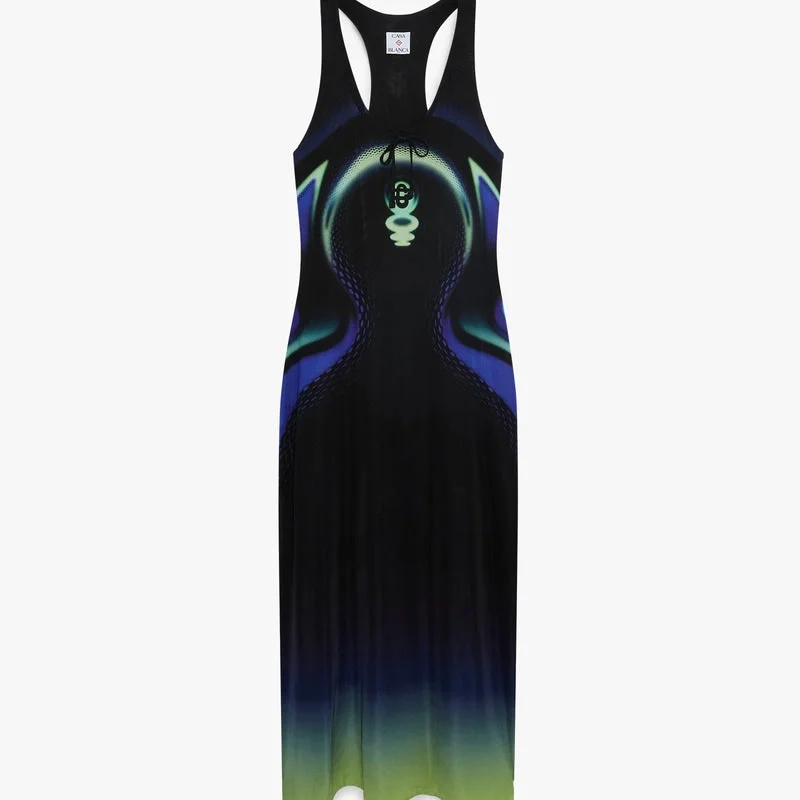 Sporchid Slinky Maxi Klänning är en raffinerad design med säsongens Sporchid-motiv; ett digitalt motiv bestående av former och gradienter som representerar kolonnen och pollinierna i orkidéblomman. Kompletterad med rund halsringning, racerrygg, sidoslitsar och en ärmlös silhuett.