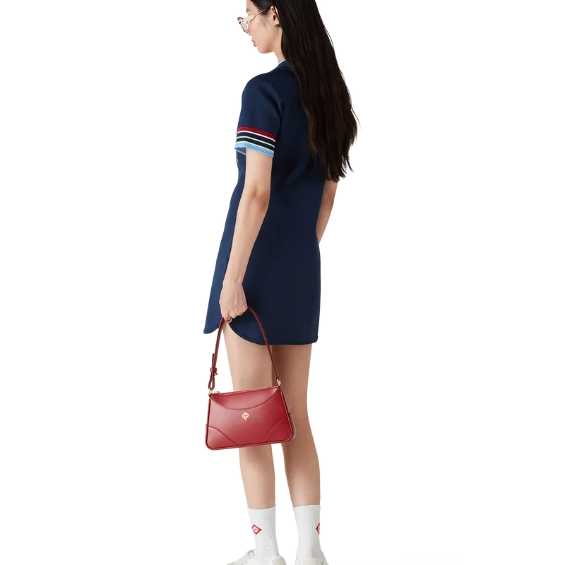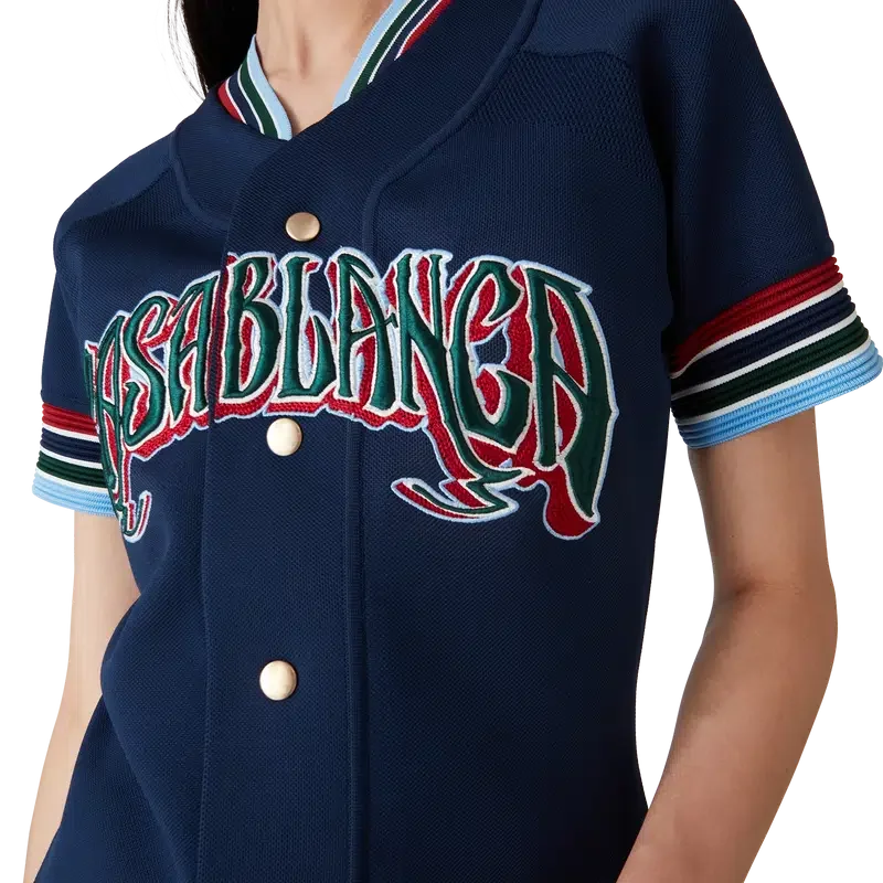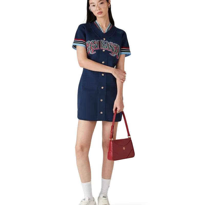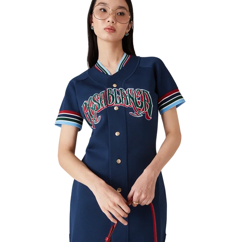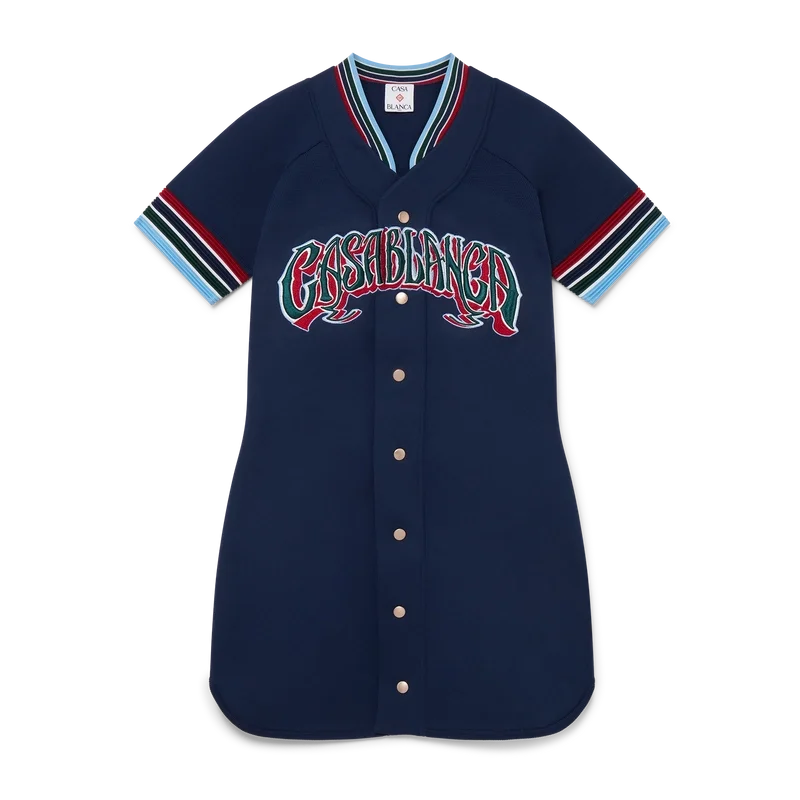 Den stickade basebollklänningen är en miniklänning tillverkad av ett stickat tyg med broderad handritad typografi av Casablanca-logotypen, inspirerad av den gotiska typsnittet som används i tatueringar. Avslutas med knäppning, guldpläterade tryckknappar med märkeslogotyp, kontrasterande röda, vita, marinblå, gröna och blå randdetaljer på ärmslut och krage samt rundad nederkant.
