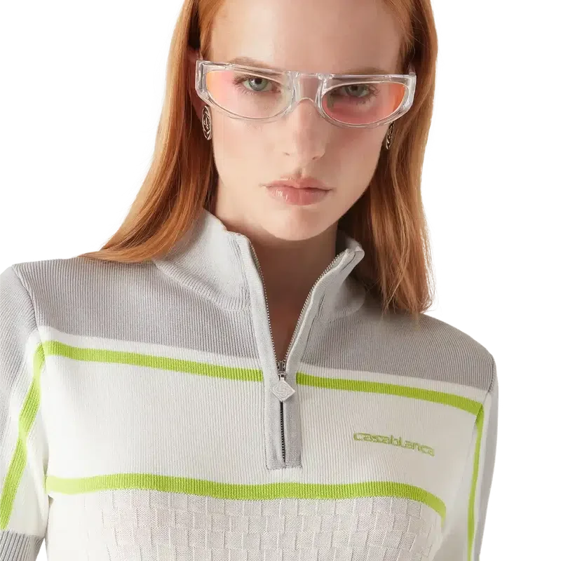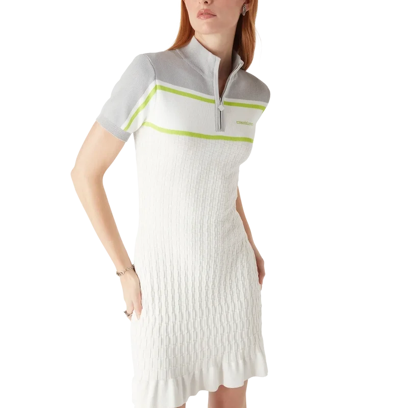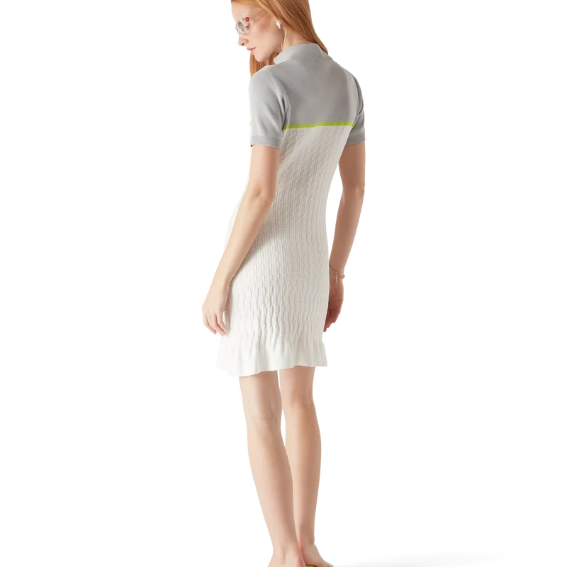 Tennispoloklänningen är en kortärmad stickad modell med kontrasterande axlar och ärmslut. Den har dragkedja med märkets signaturdiamantlogotyp på dragkedjetappen, hög krage, randiga detaljer, signatur Casablanca-logotyp, ribbade muddar och volangdetaljer i nederkanten.
