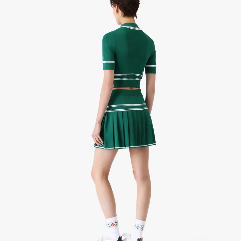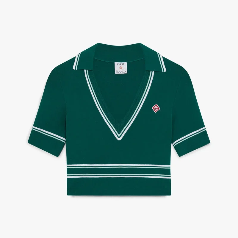 Den gröna korta stickade pikétröjan är en raffinerad stickad design med husets signaturdiamantlogo. Kompletterad med ribbad krage, muddar och fåll med kontrasterande vita randdetaljer, en djup V-ringning och en figursydd silhuett.
