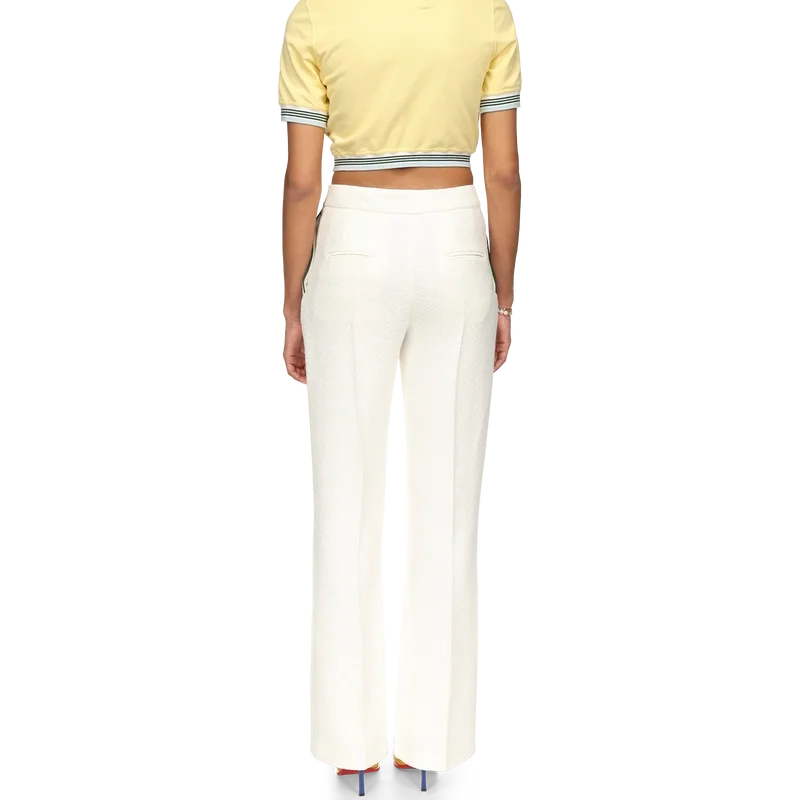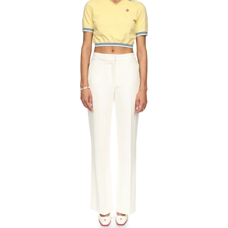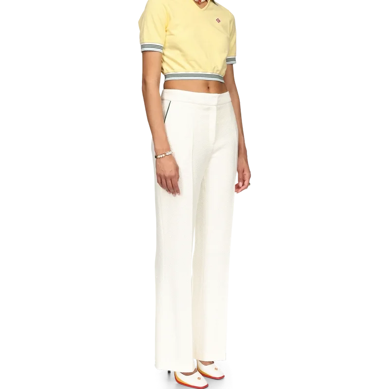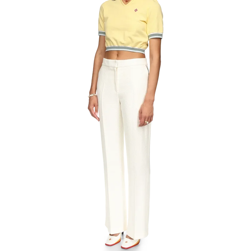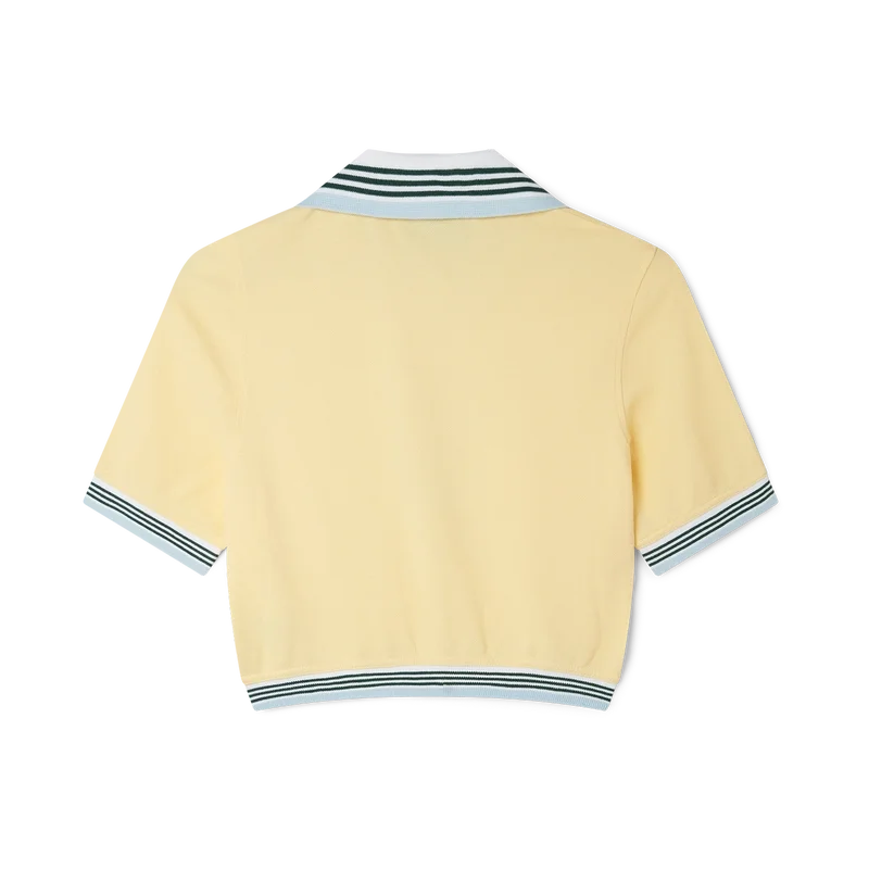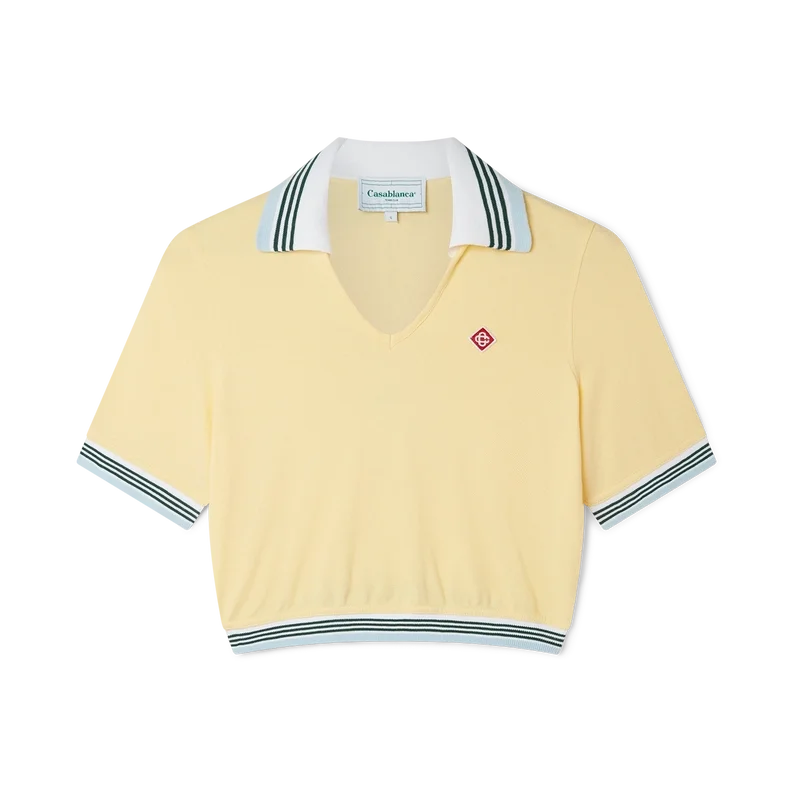 Den korta pikétröjan är en kortärmad modell med V-ringning och en lätt rynkad nederkant. Tillverkad i 100 % bomullspiké och försedd med randiga ribbade krage och muddar, Casablanca-märkesetikett och husets diamantlogotyp.