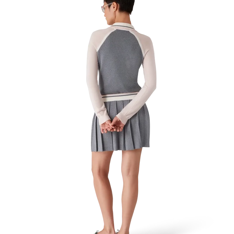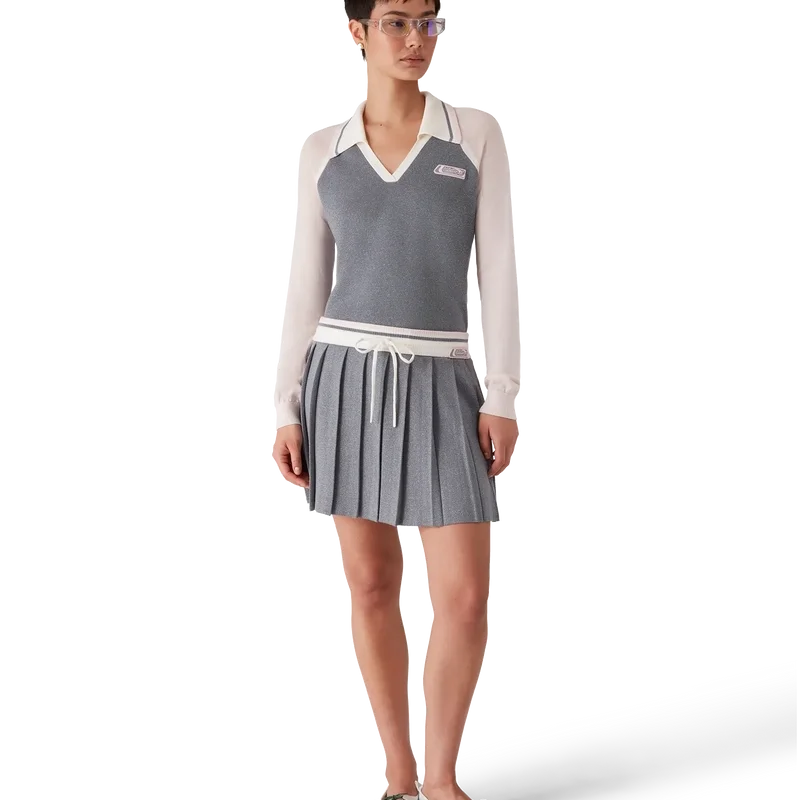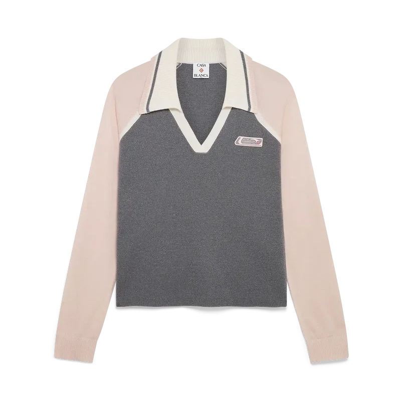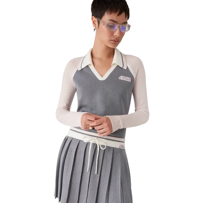 Merino Tennis långärmad pikétröja är en stickad modell med märkets silikonlogotyp. Den har en ribbad krage med randiga kanter, V-ringning och raglanärmar med ribbade kanter.