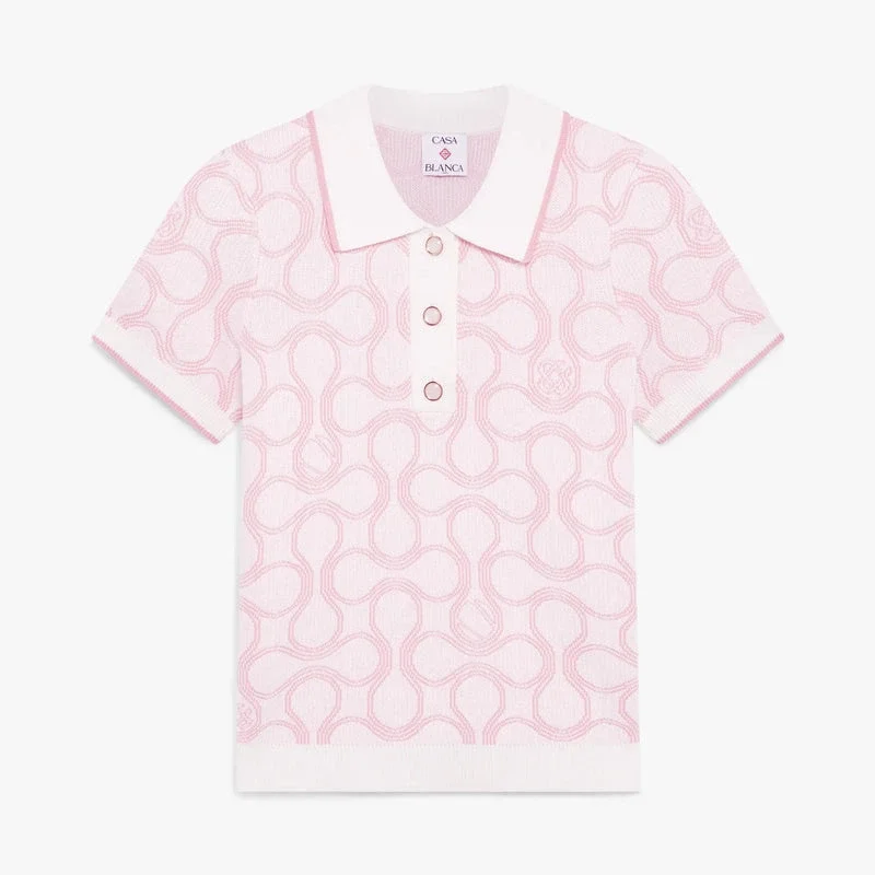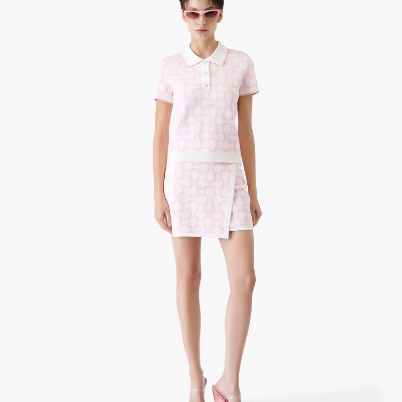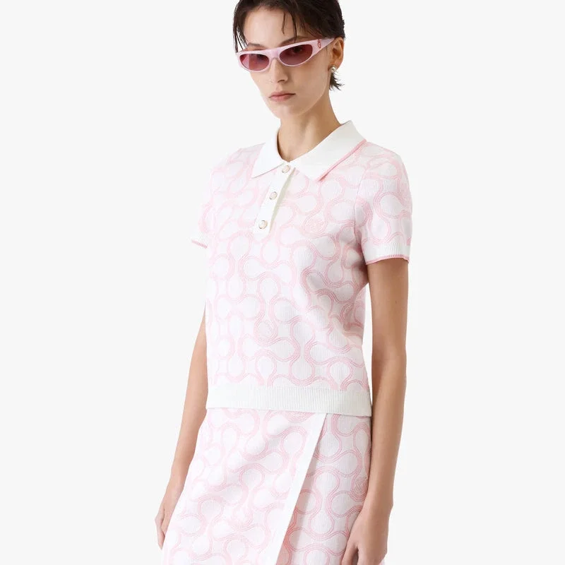 Optic Drop-pikétröjan är en raffinerad stickad design med säsongens konstverk i husets Bourgeois-färgskala. Kompletterad med en klassisk ribbad krage, knäppning, manschetter och fåll med kontrasterande kantdetaljer, knäppning, signaturknappar med guldkant och korta ärmar i en smal silhuett. Designad för att bäras med den matchande minikjolen.