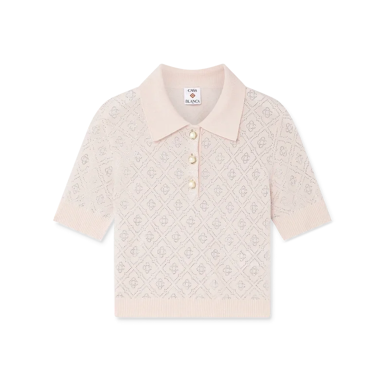 Crystal Monogram Knit Pikétröja är en kortare modell tillverkad av merinoullstyg och prydd med husets Crystal Monogram. Den kompletteras med signaturknappar i guldkantade pärlor, ribbad krage, muddar och nederkant – designad för att sitta ovanför naveln.
