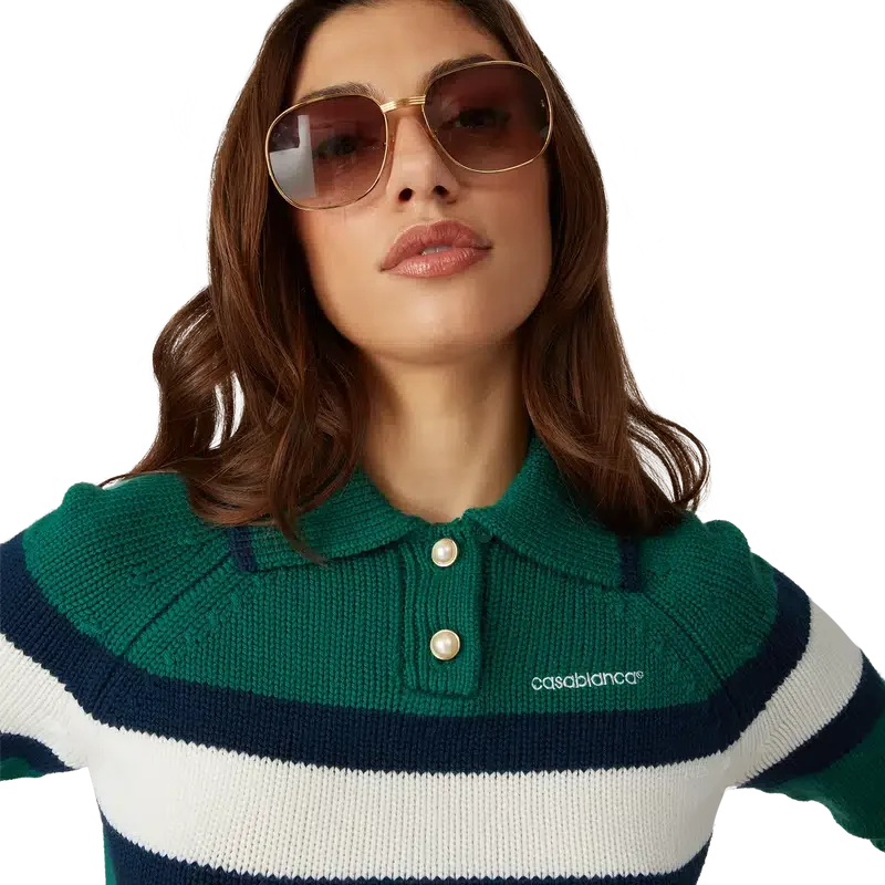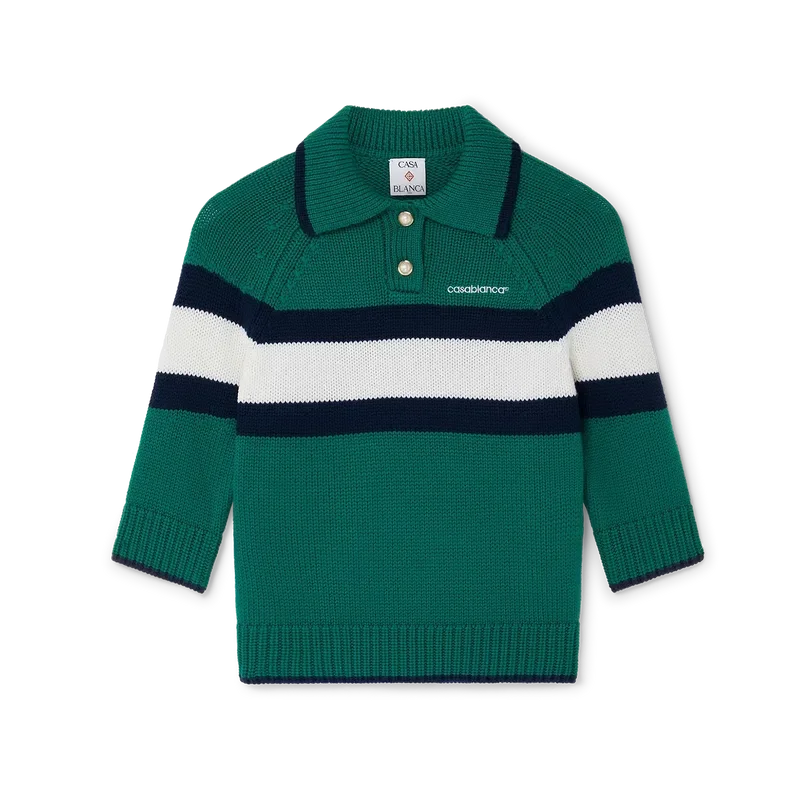 Den färgblockerade pikétröjan är en kortare modell med långa ärmar, tillverkad i merinoull och med blå och vita ränder över bröstet och ryggen. Kompletterad med raglanärmar, ribbade muddar, nederkant och krage, signaturknappar med guldkant och Casablanca-logotyp.<!–